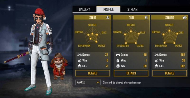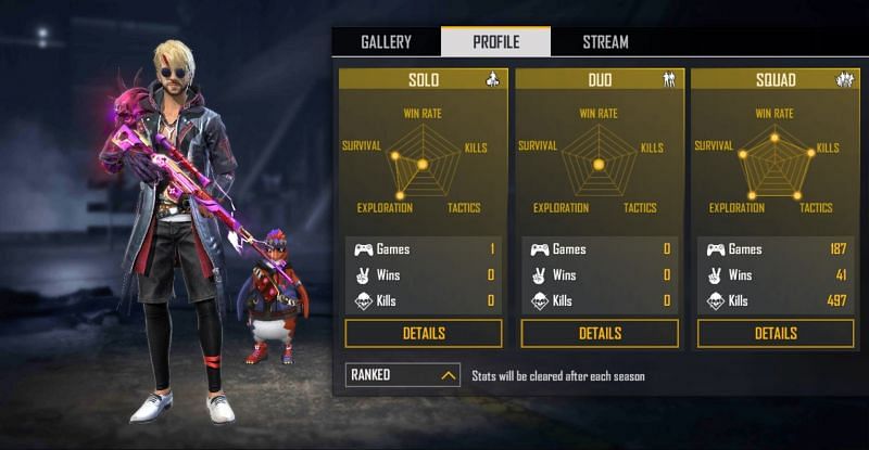 In the 174 duo matches, the YouTuber has 38 Booyahs, translating to a win rate of 21.83%. He has close to 430 frags to his name with a K/D ratio of 3.15.