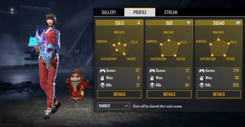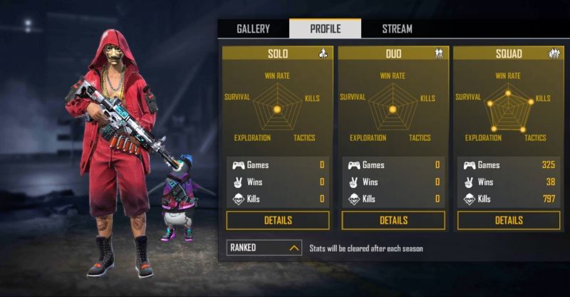The streamer has played 325 squad games and got the better of his foes on 38 occasions, equating to a win rate of 11.69%. He has secured close to 800 kills and has a K/D ratio of 2.78.