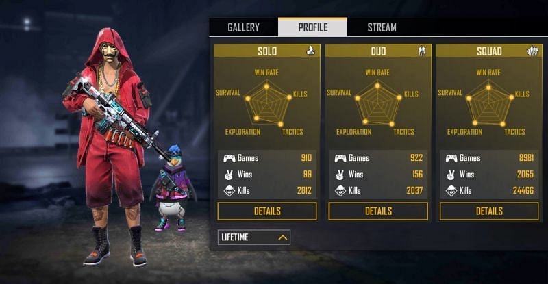 Lastly, in solo games, the content creator is one short of 100 Booyahs and has played 910 games, sustaining a win percentage of 10.87%. He has 2812 frags for a K/D ratio of 3.47.