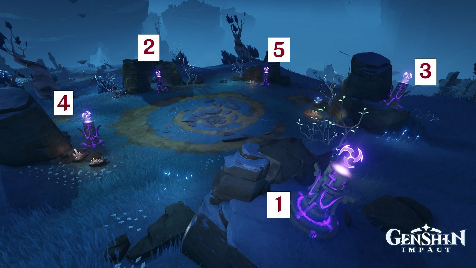 The hint to complete this test is observing an Electro Seelie movement near the area. The Seelie will fly to each totem in order, and you must hit the monuments with Electro attacks accordingly.