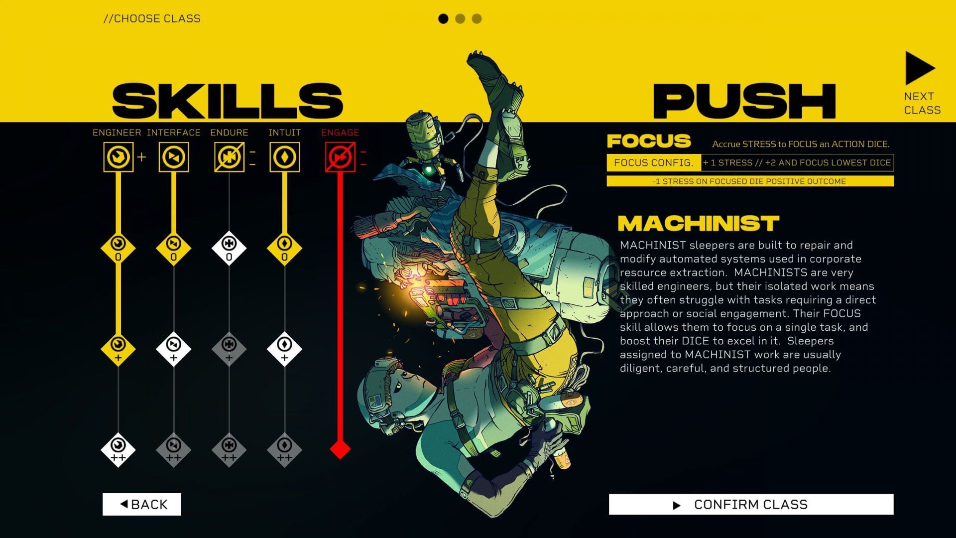 They start with the obvious +1 to the Engineer stat, allowing players to mend and modify tech as needed. However, with a -2 to Engage, they are not ideal for taking charge and diving headfirst into a situation, unlike the Extractor. Their Push ability is Focus, boosting their Action Dice value when needed.
