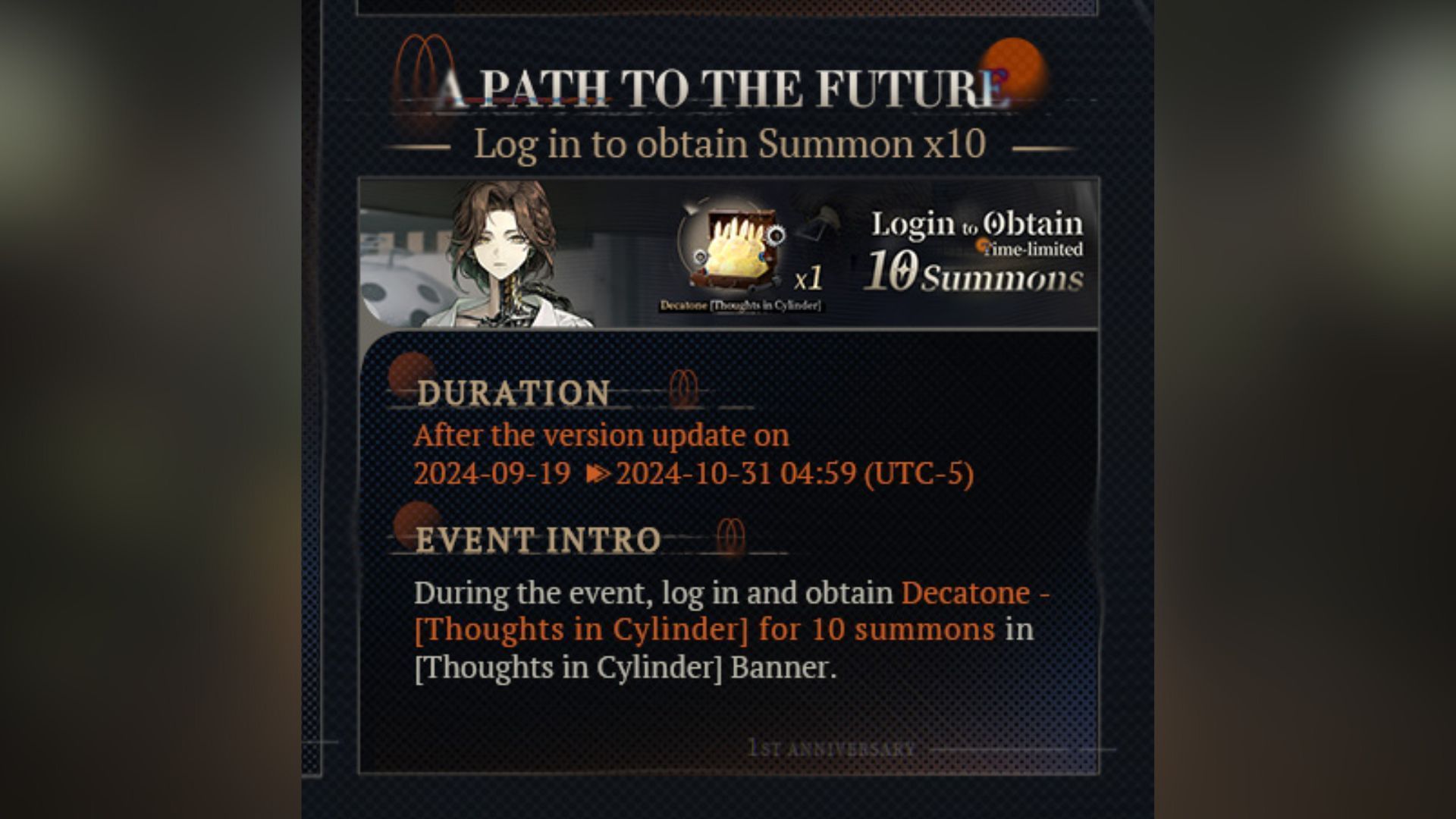 Players can get ten summons as free rewards in the Reverse 1999 version 1.9 first anniversary update through A Path To The Future login event. It will start from September 19 to October 31, 2024, at 04:59 UTC-5. Log in during the period to obtain the reward, and use these free summons in the Thoughts in Cylinder banner.