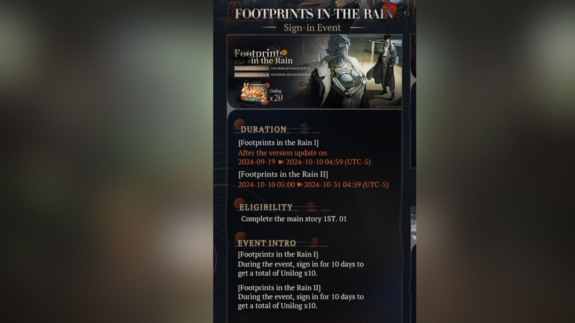 Players can get 20 Unilogs as free rewards in the Reverse 1999 version 1.9 first anniversary update. They must participate in the Footprints In the Rain sign-in event to obtain free Unilogs. Bluepoch will conclude this event in two parts. The first part will be available from September 19 to October 10, 2024, at 04:59 UTC-5.