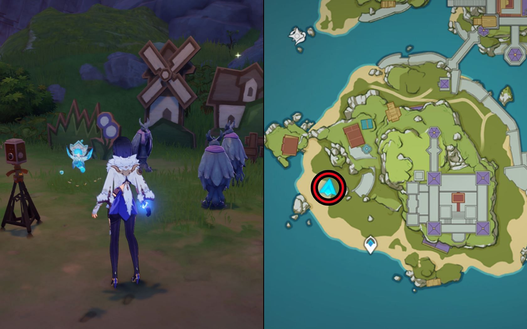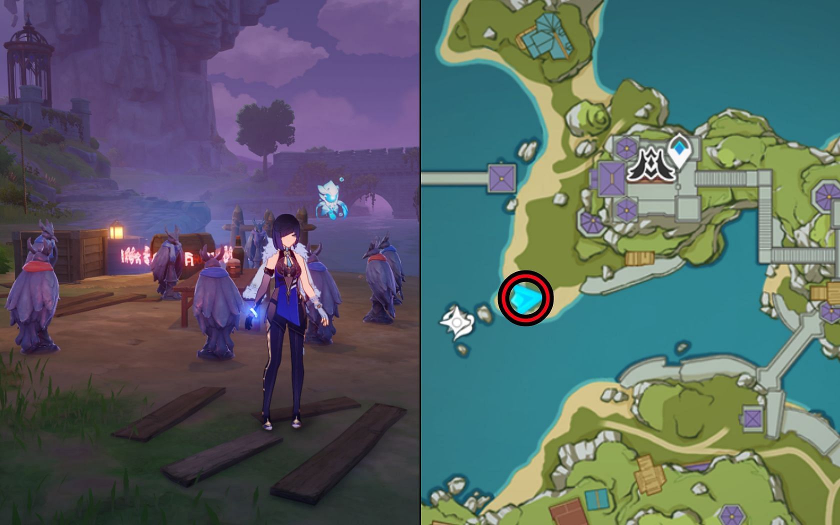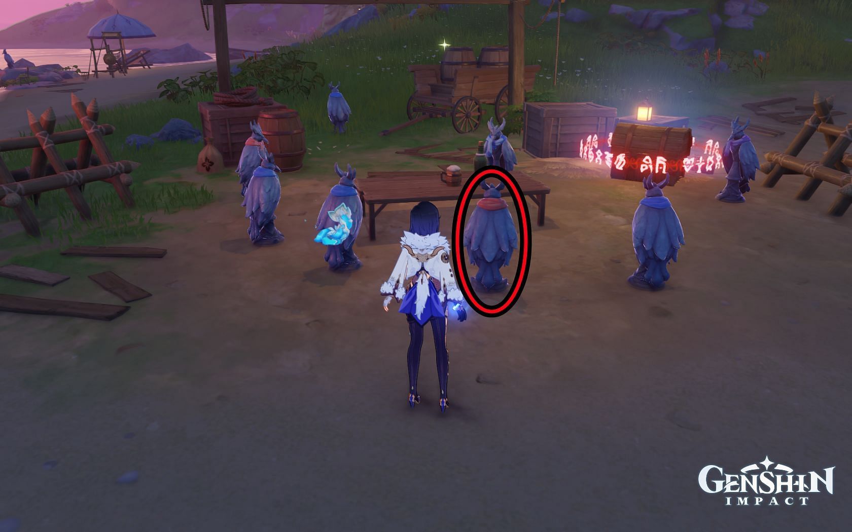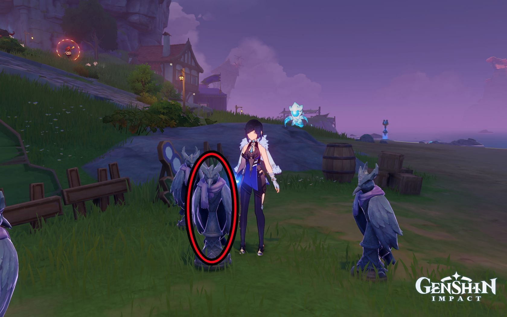 This spot is a short distance east of the last area. On the beach are some Hilichurls harassing some Night Ravens. Just defeat them and talk to the middle statue to claim your prize.