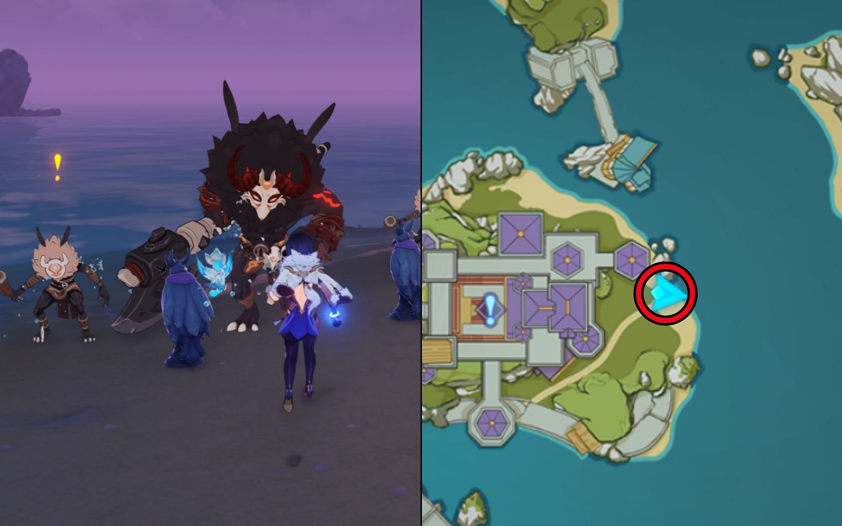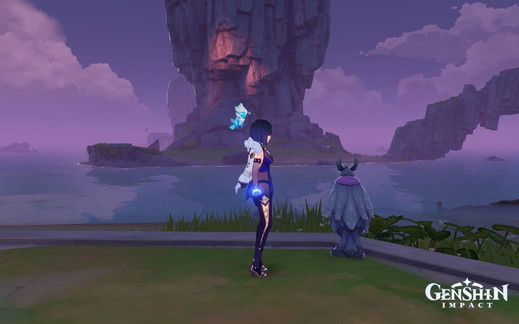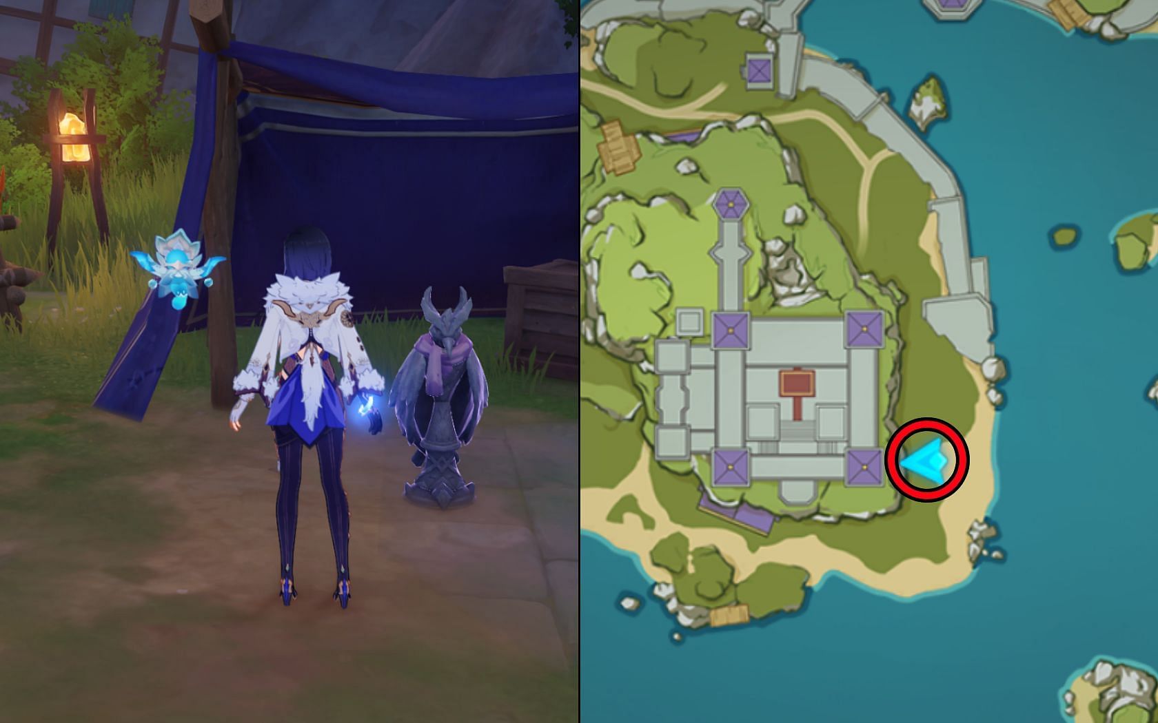 This spot is a short distance east of the last area. On the beach are some Hilichurls harassing some Night Ravens. Just defeat them and talk to the middle statue to claim your prize.
