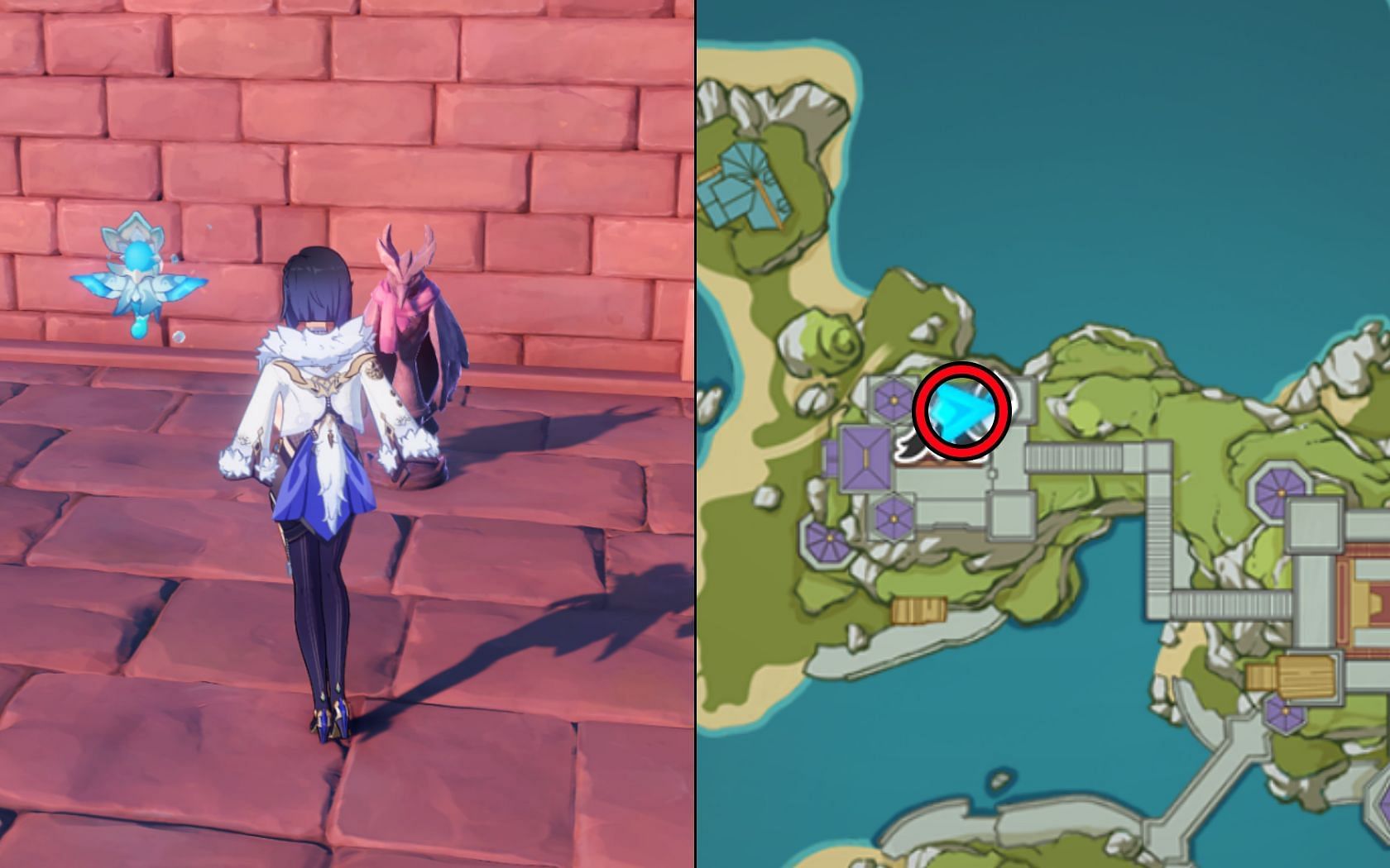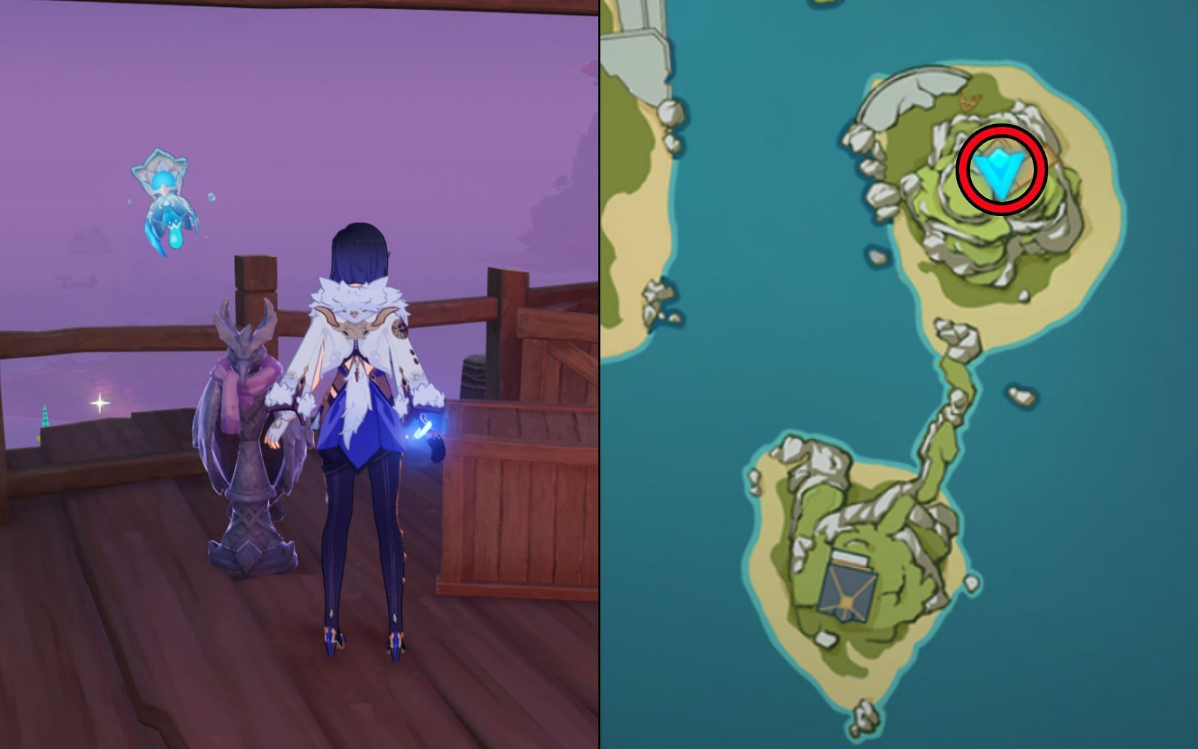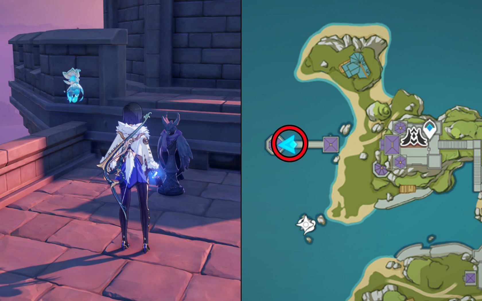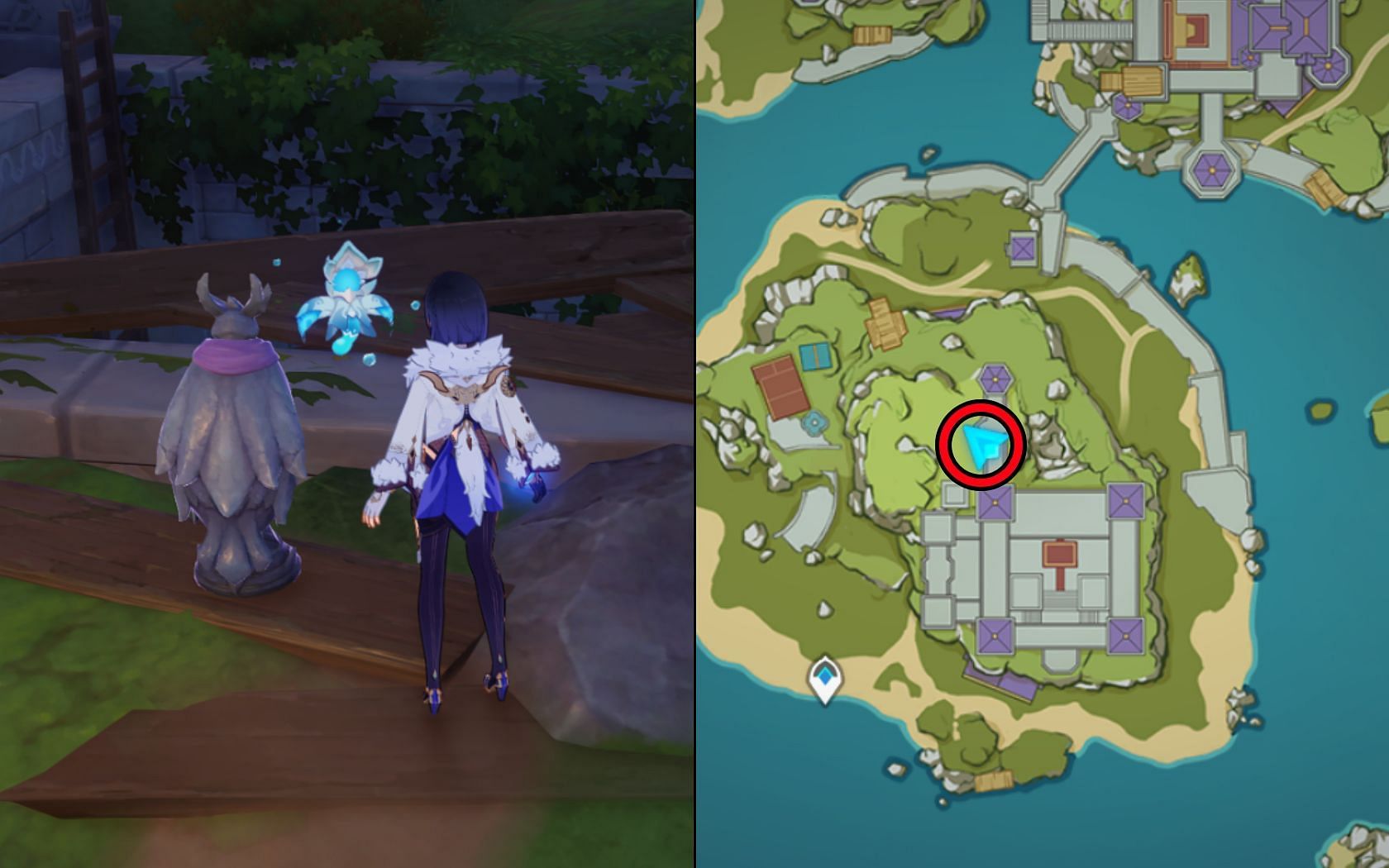 This spot is a short distance east of the last area. On the beach are some Hilichurls harassing some Night Ravens. Just defeat them and talk to the middle statue to claim your prize.