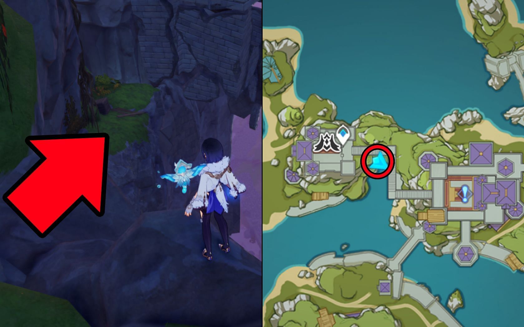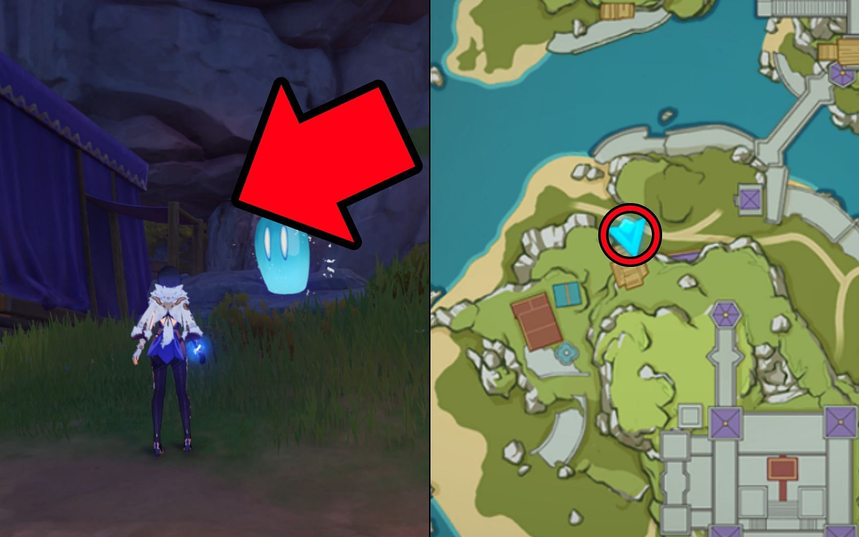 Solving this Genshin Impact puzzle can be done by going to the above location. The red arrow in that image points to a little cave that players can explore. There will be some Hydro Slimes along the way, but you should be able to deal with them easily.