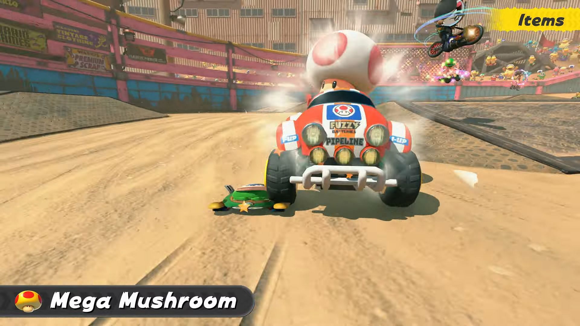 The mushroom has been a huge part of the Mario franchise, and it returns in a larger form. Mega Mushroom is a new item in Mario Kart World which can be picked up and activated to make your racer grow larger in size. This power-up can be used to drive over your opponents, which will squish and slow them down for a few short seconds, giving you the opportunity to take the lead.