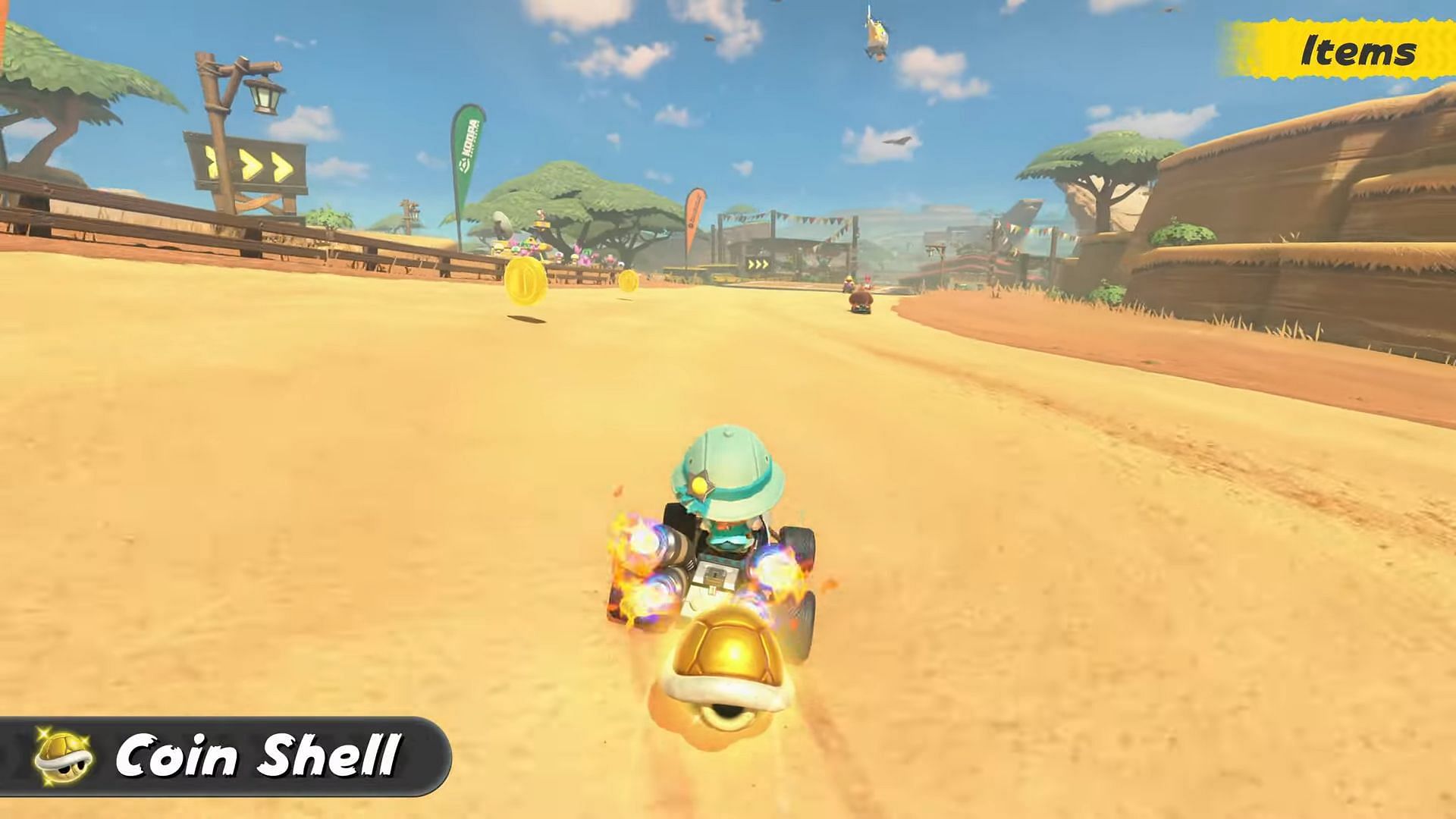 Coin Shell is the brand new addition to the list of exciting items in the upcoming entry of Mario Kart. When you pick up and activate this power-up, a trail of coins will appear in front of your kart to collect. Note that these coins can also be collected by the other racers, so gather as many as possible before others get them.