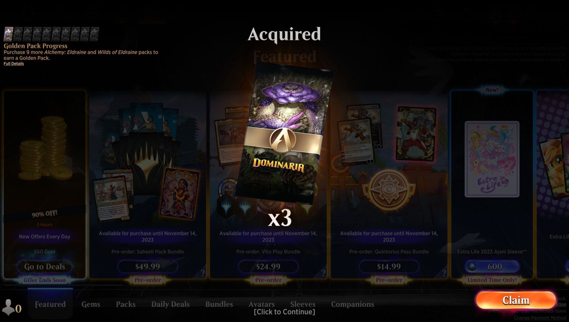 More modern sets of MTG Arena have free packs to claim in your inbox on the home screen. This has become more common with sets like The Brothers’ War, as the game phases out this style of giveaway.