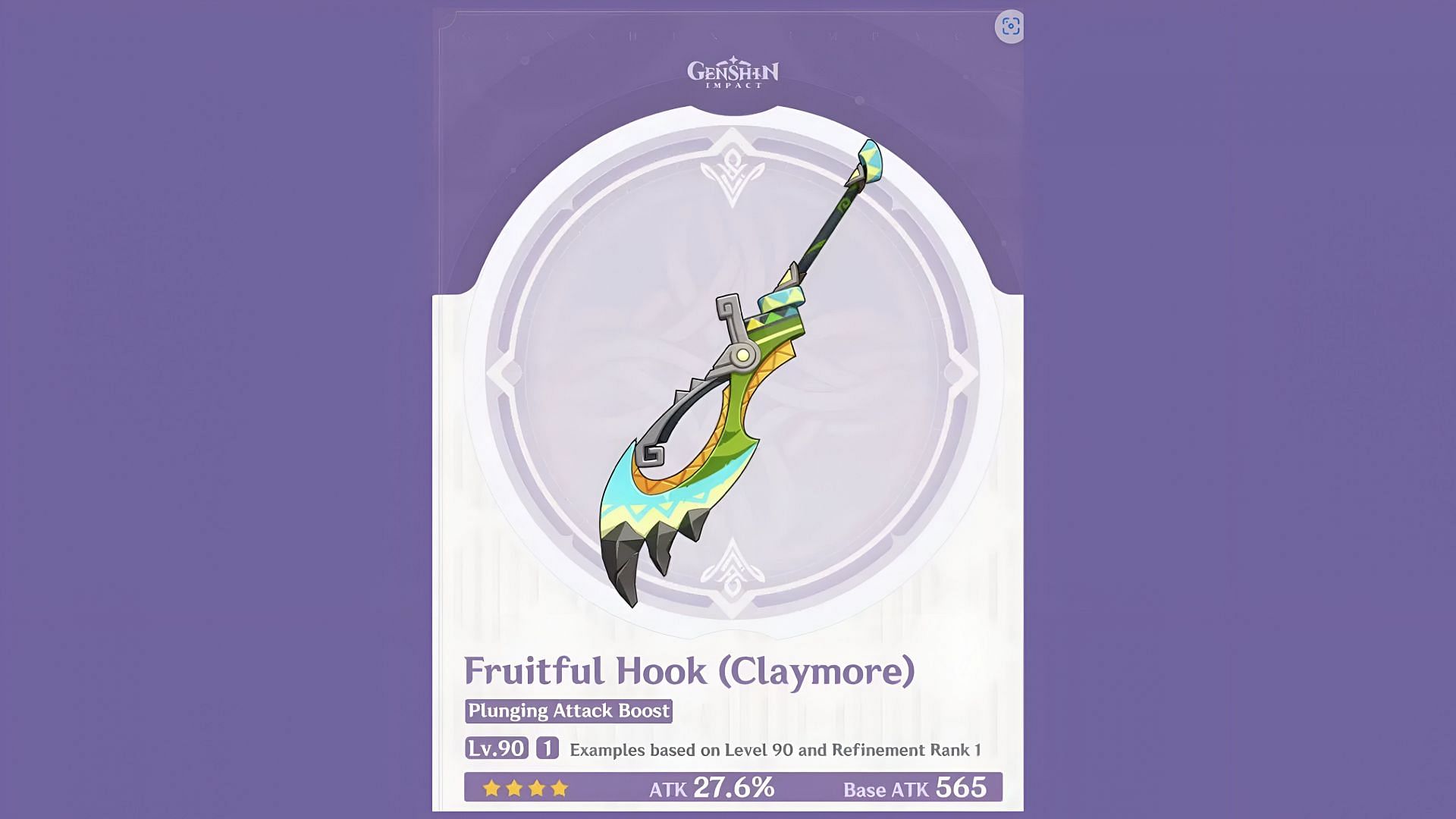 The Fruitful Hook is a new 4-star claymore that can only be obtained by players by summoning for it on the exclusive weapon's banner. The followin is an overview of the weapon's stats and its passive at level 90 and Refinement Rank 1: