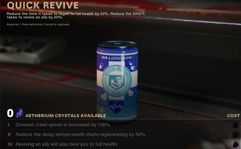 At tier 1, it grants players a 100% crawling speed increase. For tier 2, the Quick Revive Perk reduces the delay before HP regeneration begins by 50%. Its final upgraded form provides players with the additional benefit of healing back to full health when they revive an ally.