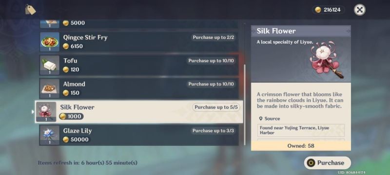 Players can purchase up to five silk flowers for 5000 Mora here. Ms. Bai restocks every item on the next day with a maximum of five purchases per day. This is the easiest way to obtain silk flowers in Genshin Impact.