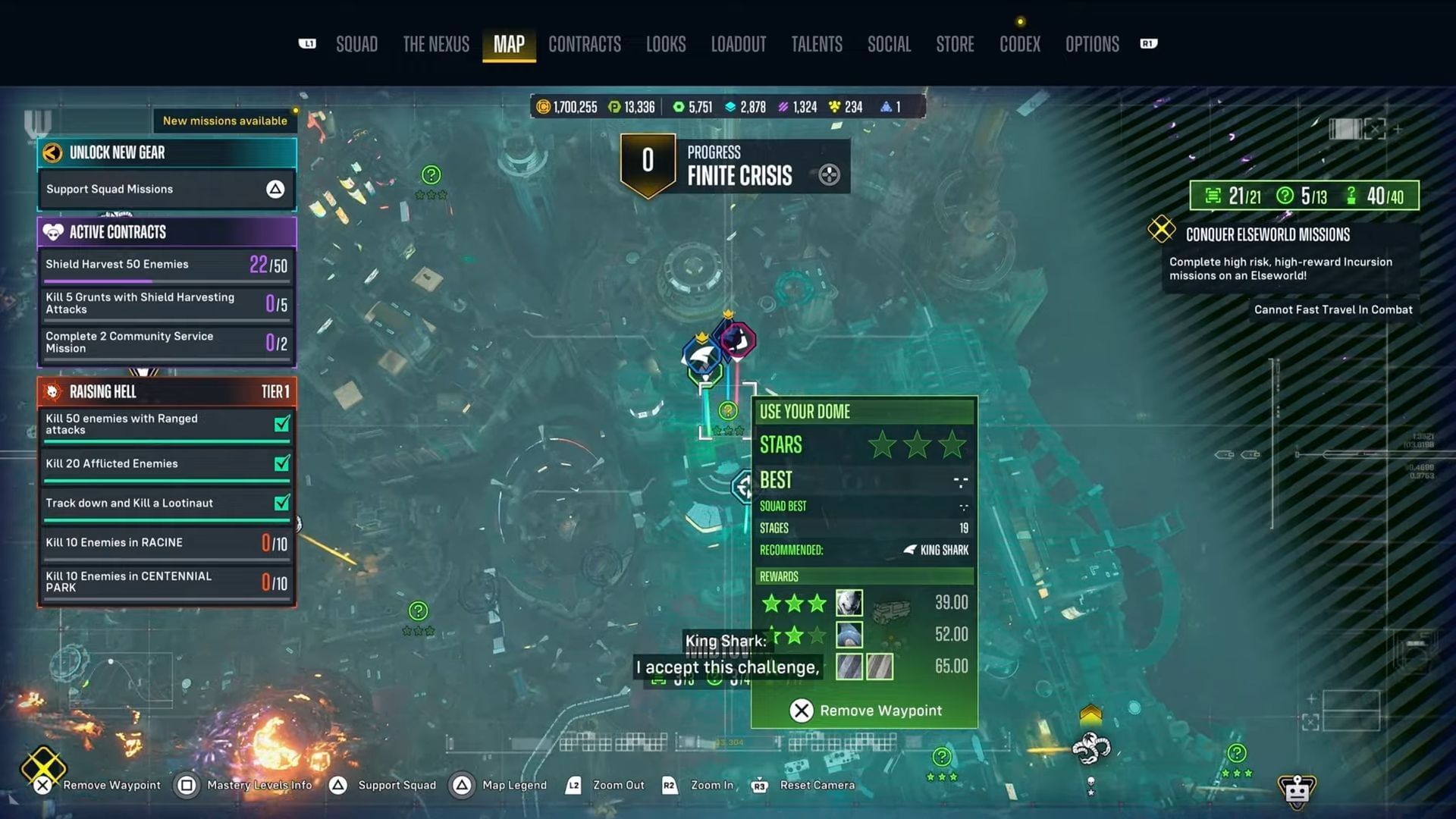 The recommended character for this challenge is King Shark. King Shark customizations and codex entry can be obtained as rewards for completing this challenge.