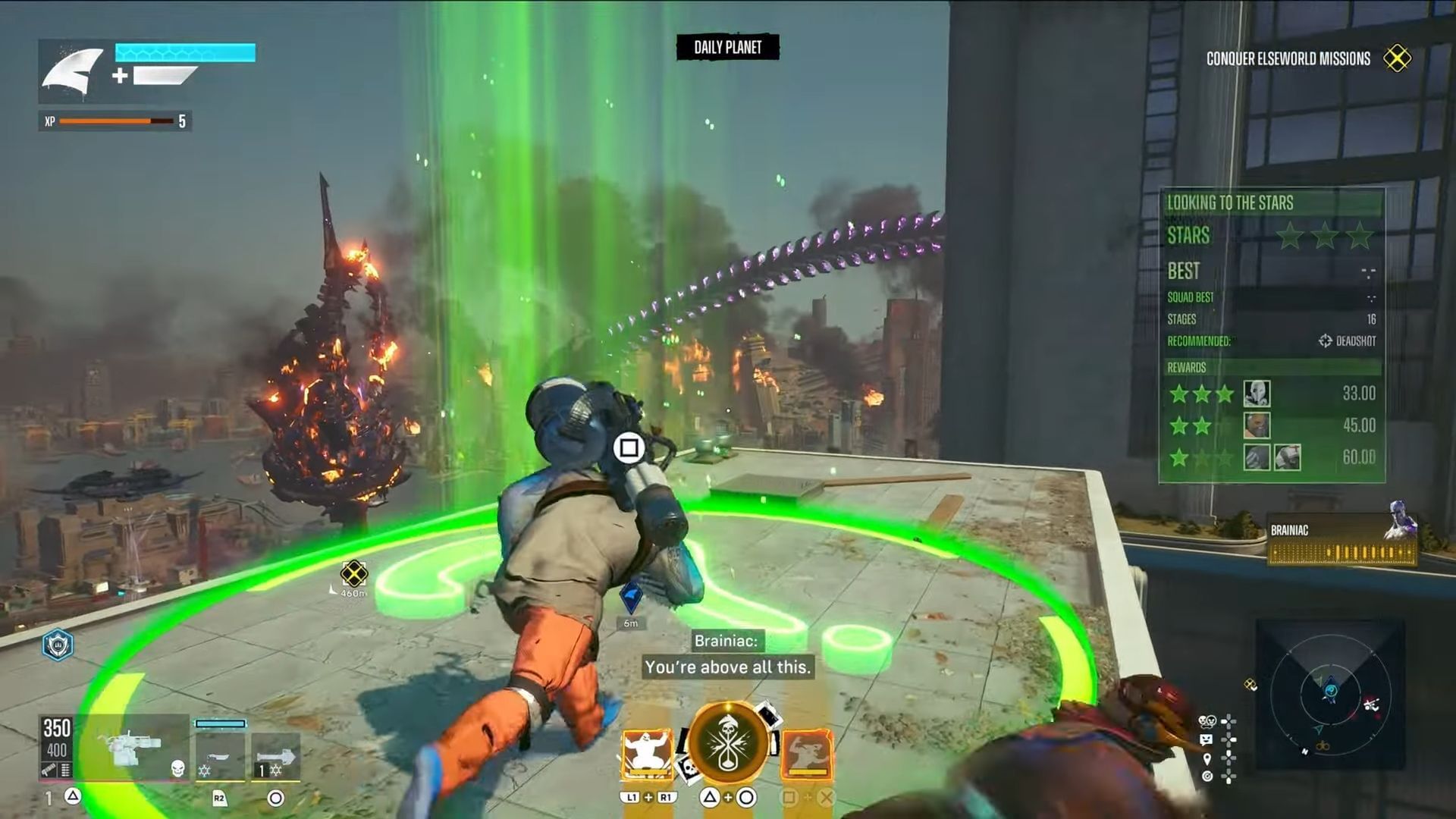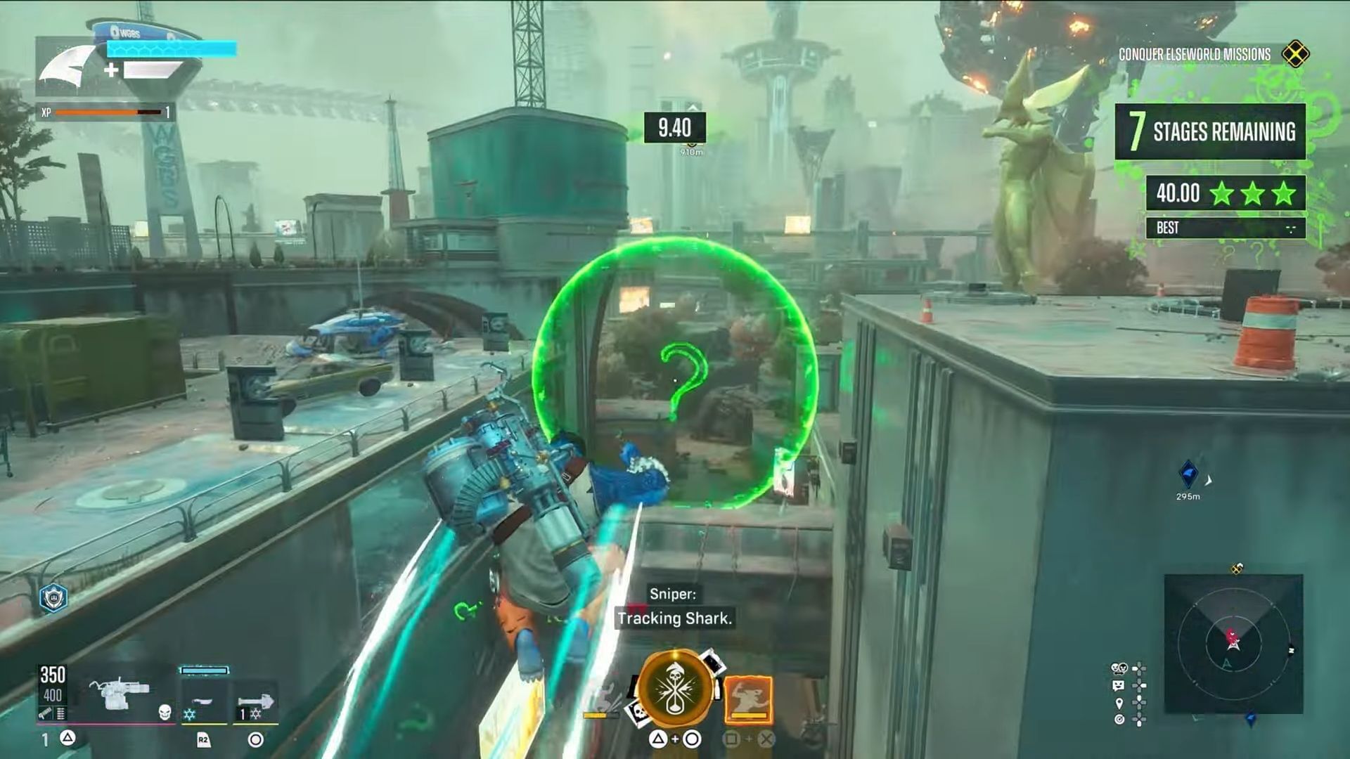 The recommended character for this challenge is King Shark. His charged jump ability is useful for the traversal moment required to complete this challenge.