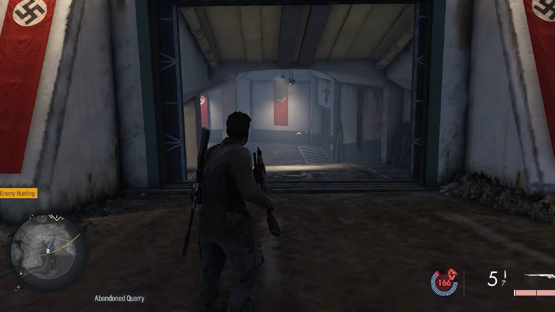 Travel to the northern part of the map until you reach the factory's main entrance, identifiable by the Nazi symbol. This location is close to your objective, and you can follow the yellow objective marker to reach it. Once there, find a small door and a staircase.
