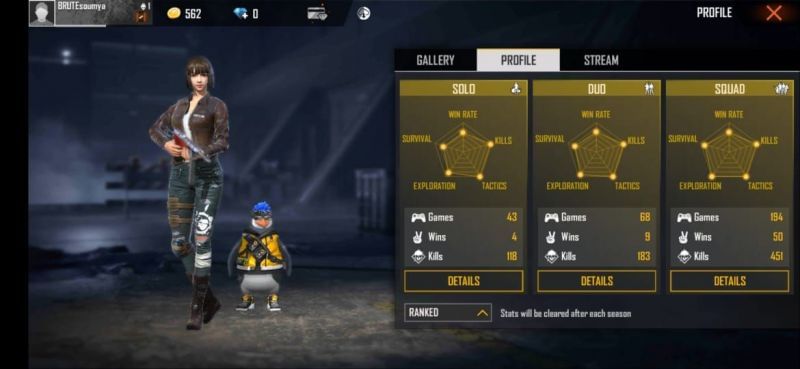 The Indian YouTuber has also played 68 duo matches and has nine Booyahs, which converts to a win rate of 13.23%. With a K/D ratio of 3.10, he has 183 frags in these matches.