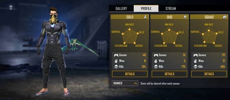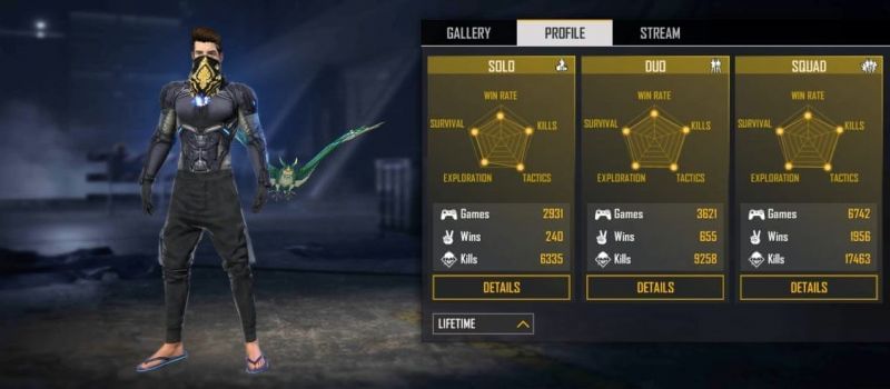 In the solo mode, he has played 2931 games and has won 240 of them. With 6335 kills, he has a K/D ratio of 2.35.