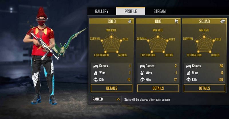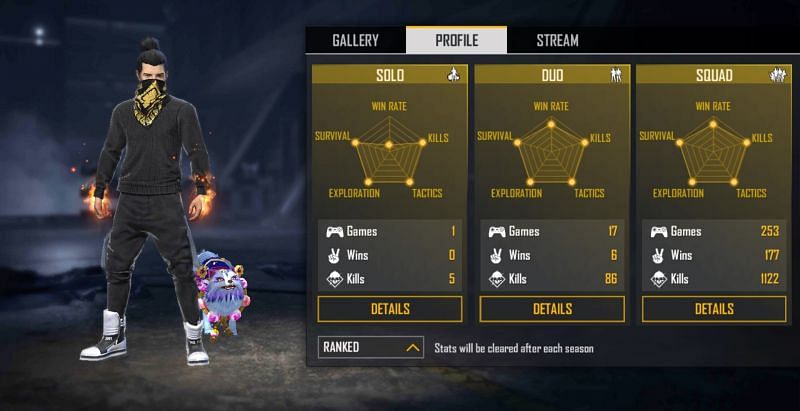 The content creator has also played 17 duo matches and has won 6 of them, maintaining a win rate of 35.29%. With 86 kills to his name in this mode, he has a K/D ratio of 7.82.