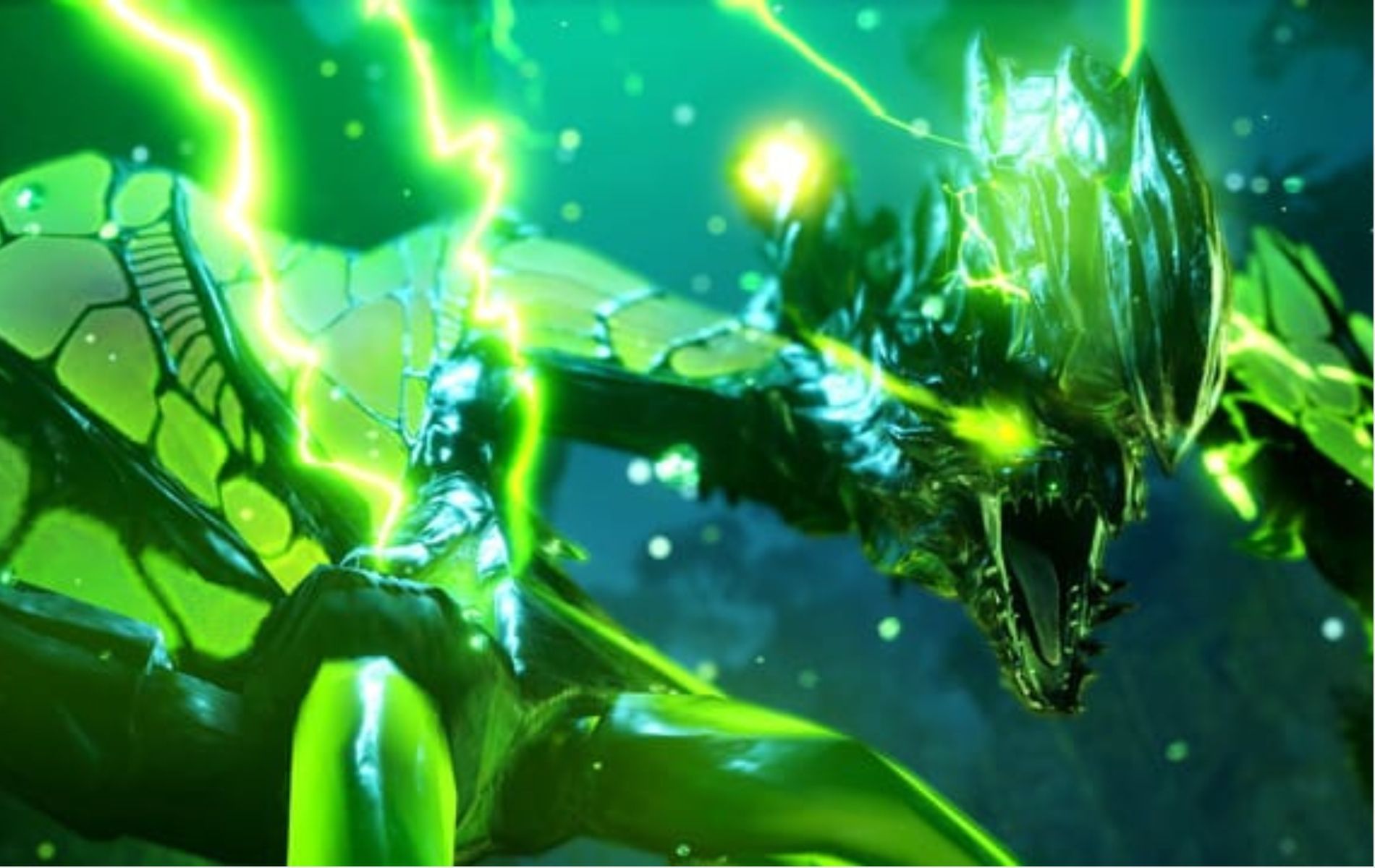 The Boltreaver Astalos can supercharge itself, changing the color of its scales from dark green to blue. In this state, it can also generate a blade-like beam of electricity from its forehead.