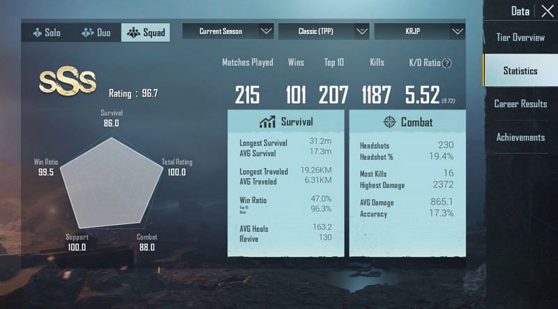In the KRJP server, the streamer has played more matches, and is placed in the Conqueror tier. Athena Gaming has played 215 games and has 101 victories for an excellent win rate of 47%. He also has 207 top-ten finishes, which is a testament to his consistency. The content creator has amassed 1187 kills at an exceptional K/D ratio of 5.52 and average damage per match of 865.1.