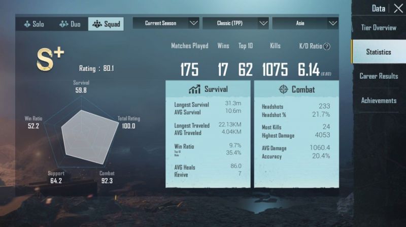 In the Asia server, Serioton is placed in Crown V. He has featured in 175 squad matches and got better of his foes in 17 of them, which translates to a win rate of 9.7%. The famous YouTuber has 62 top-ten finishes and has notched up 1075 kills, maintaining a jaw-dropping K/D ratio of 6.14 and average damage per match of 1060.4.