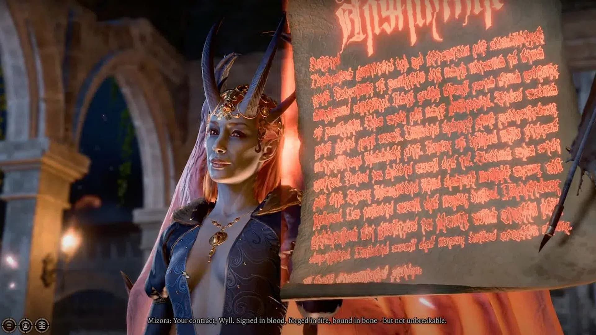 Mizora further explains the details of the agreement. If you sign the contract, Duke Ravengard's location will be revealed to you, and your team can come rescue him immediately. However, if you do the opposite, the Duke dies an agonizing death. At least, that's what Mizora tells you.