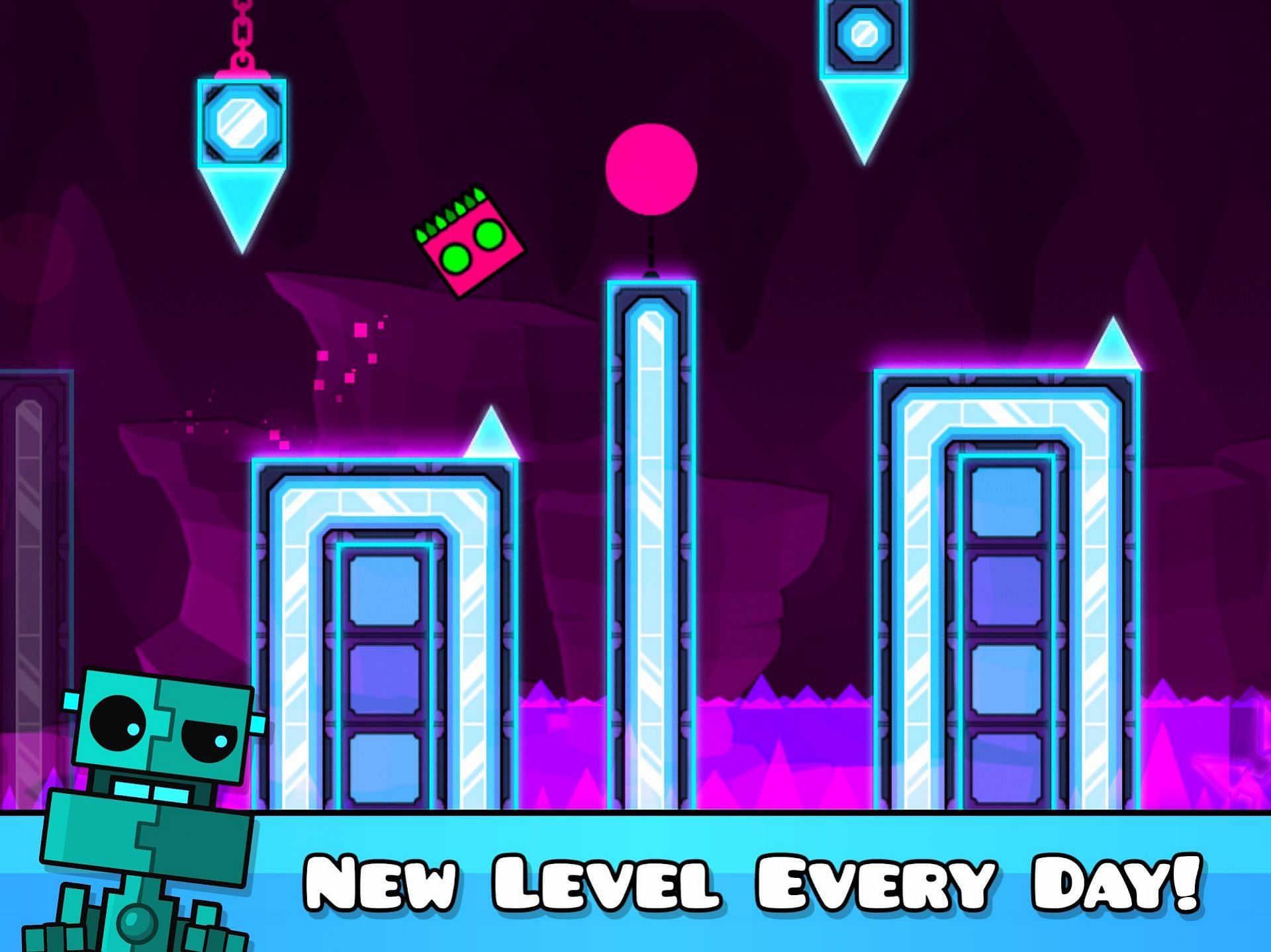 The entire series of Geometry Dash is known for its blend of rhythm-based gameplay with high-precision platforming mechanics. The core gameplay loop involves synchronizing jumps and movements with the game's energetic sound score. It requires players to precisely time and recognize patterns to overcome increasingly difficult obstacles.