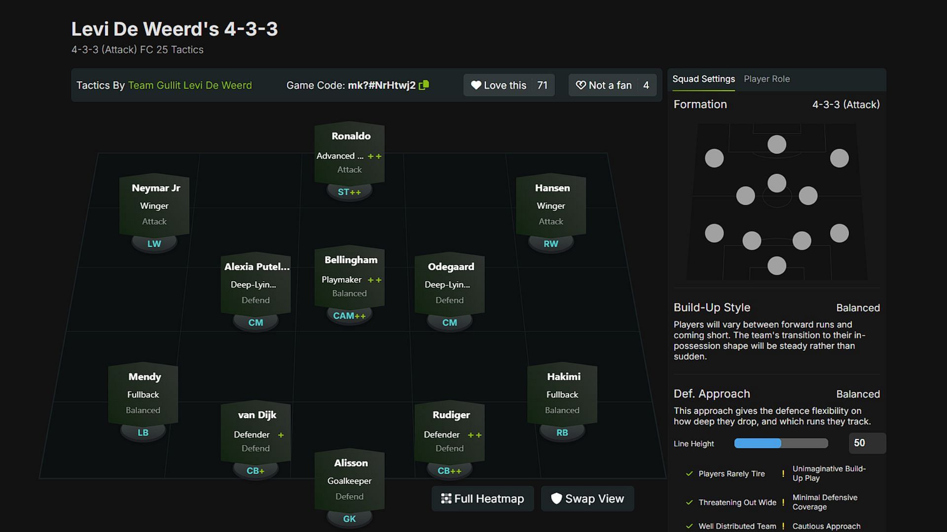 This classic 4-3-3 formation designed by Levi De Weerd offers a balanced attack and defense, making it perfect for players who want to control the game on both ends.