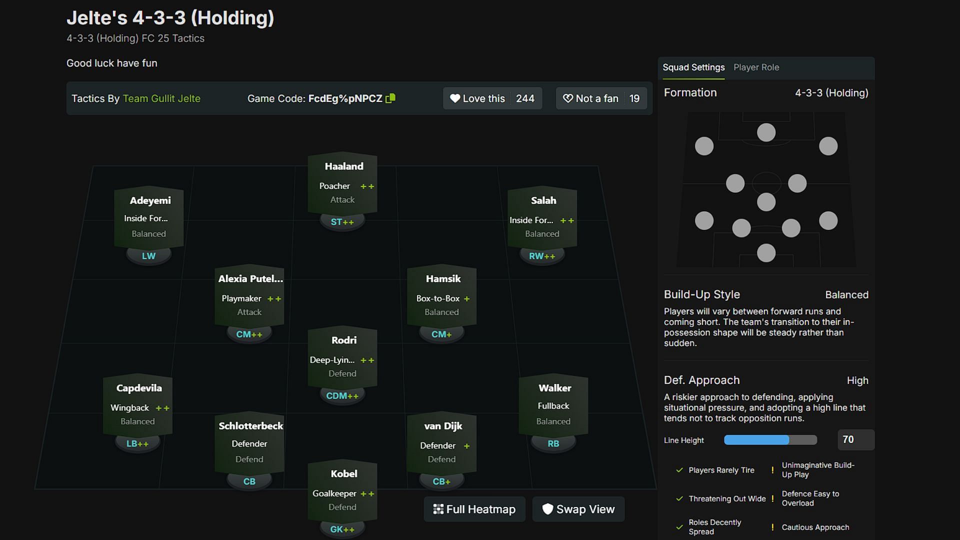 This custom tactic comes from Jelte of Team Gullit and is perfect for players who like to balance solid defense with controlled, attacking play. The 4-3-3 Holding formation ensures width in the attack while maintaining defensive stability through the midfield and backline.