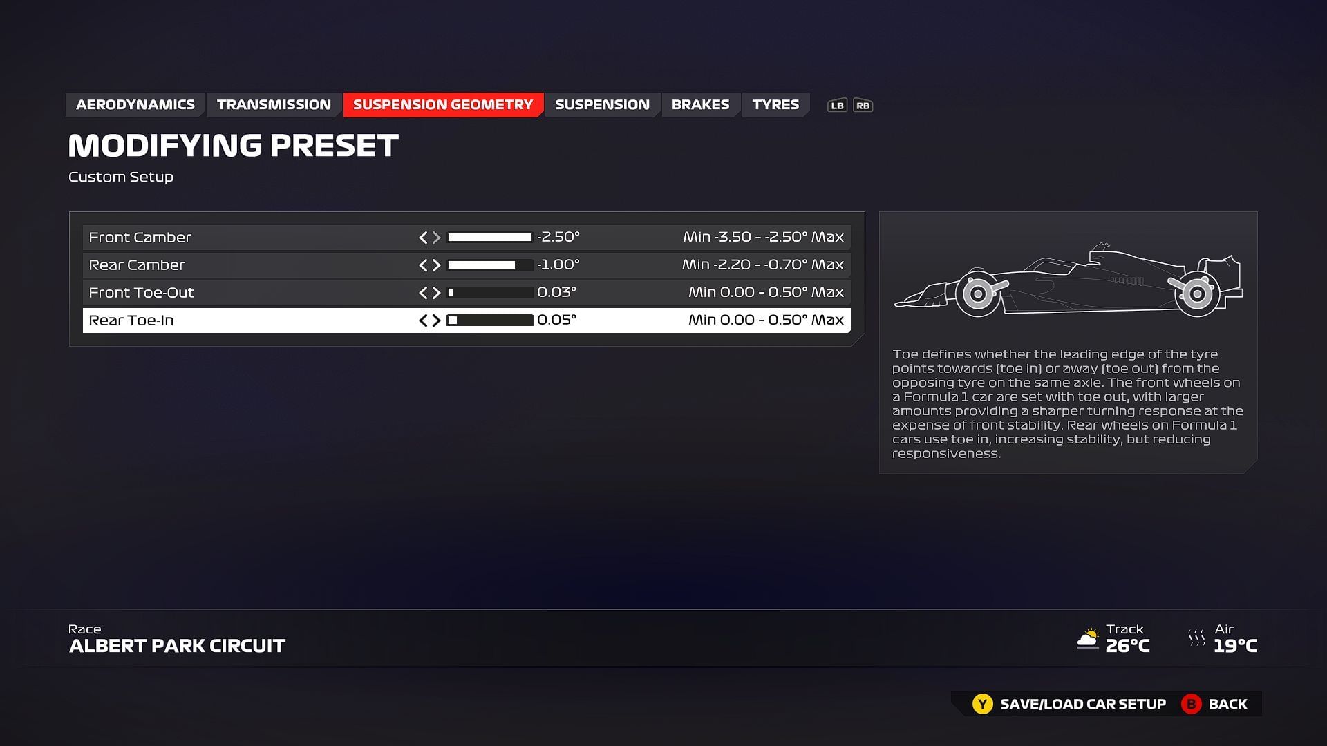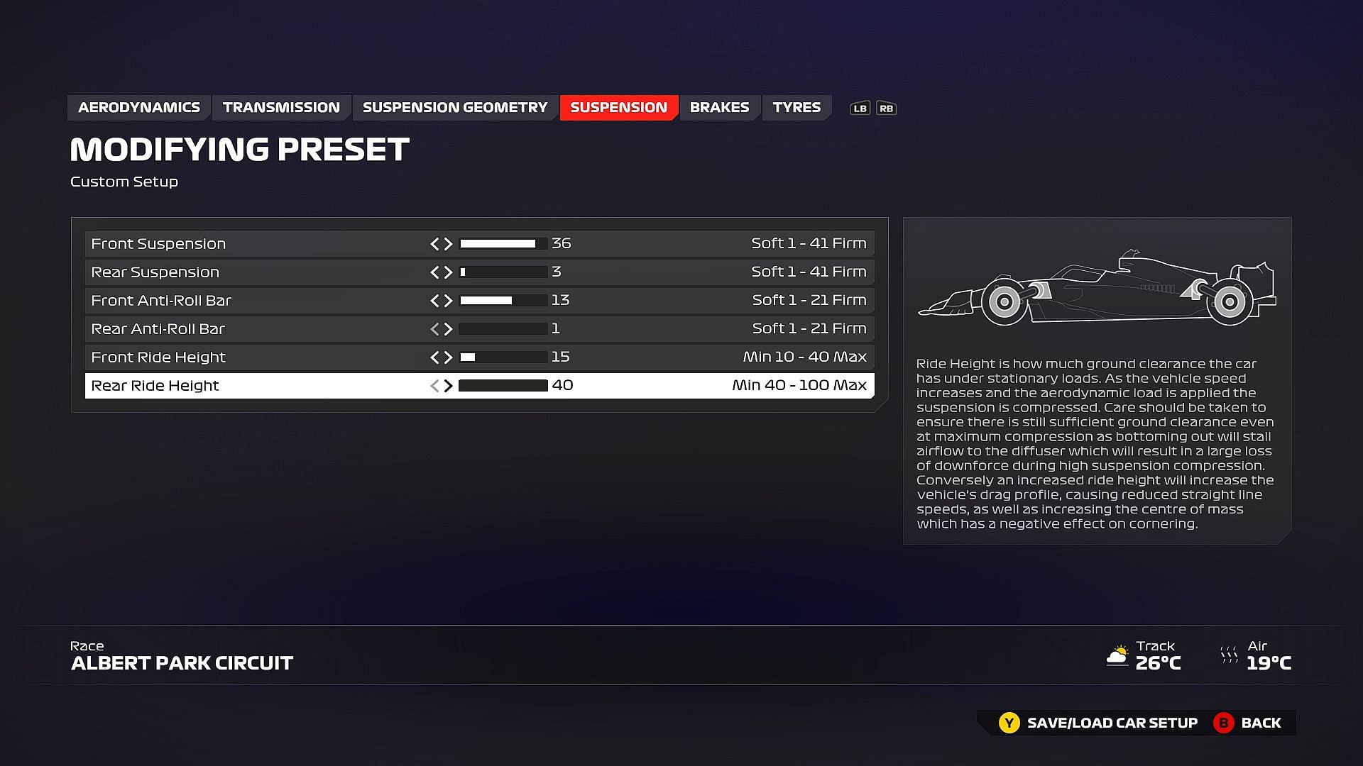 To excel at Albert Park, you will need a setup that balances speed with stability, particularly in high-speed corners. High-speed corners require more downforce to keep your car stable at your top speeds, so using preset 2 or 3 should yield a decent performance.