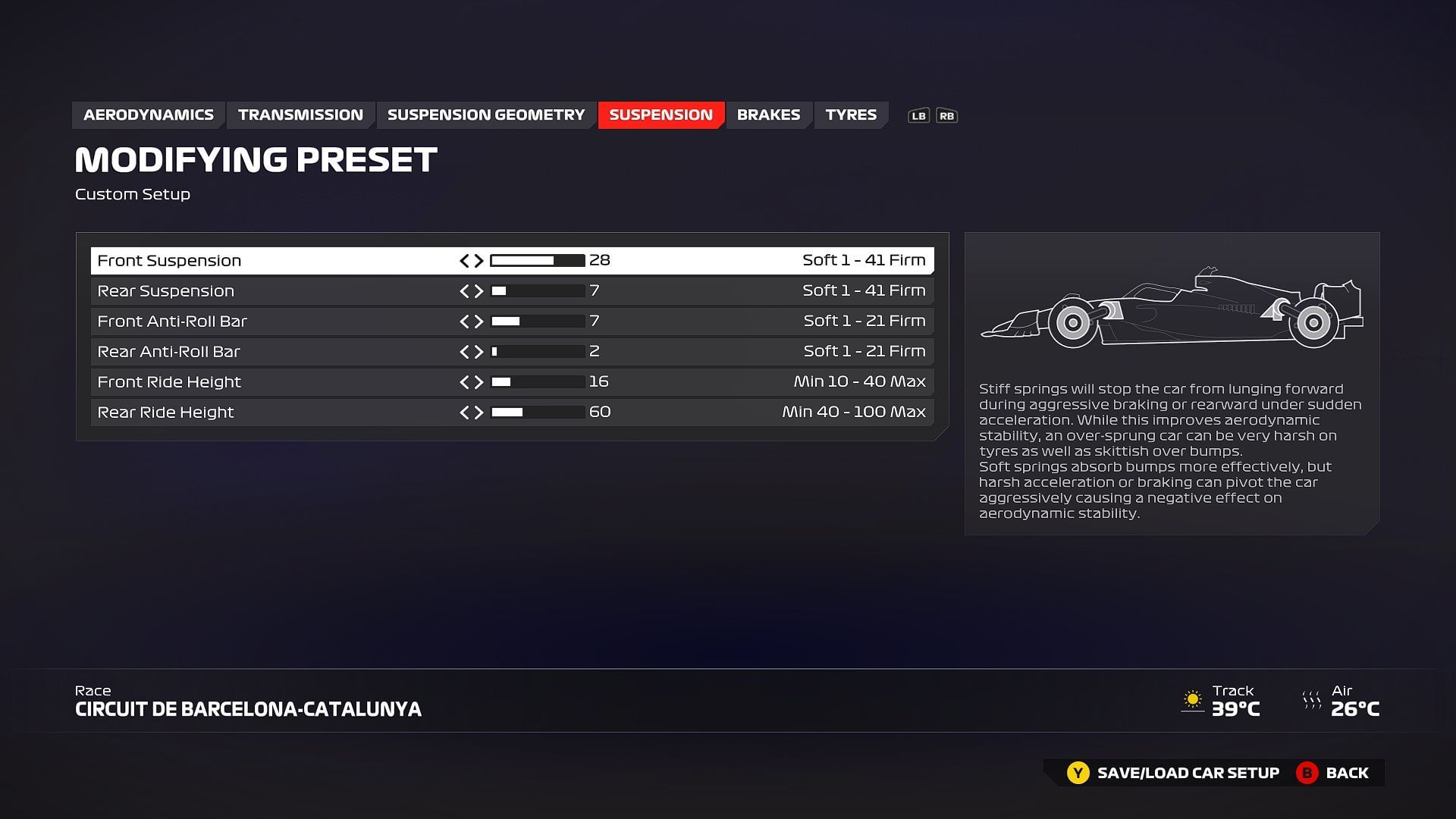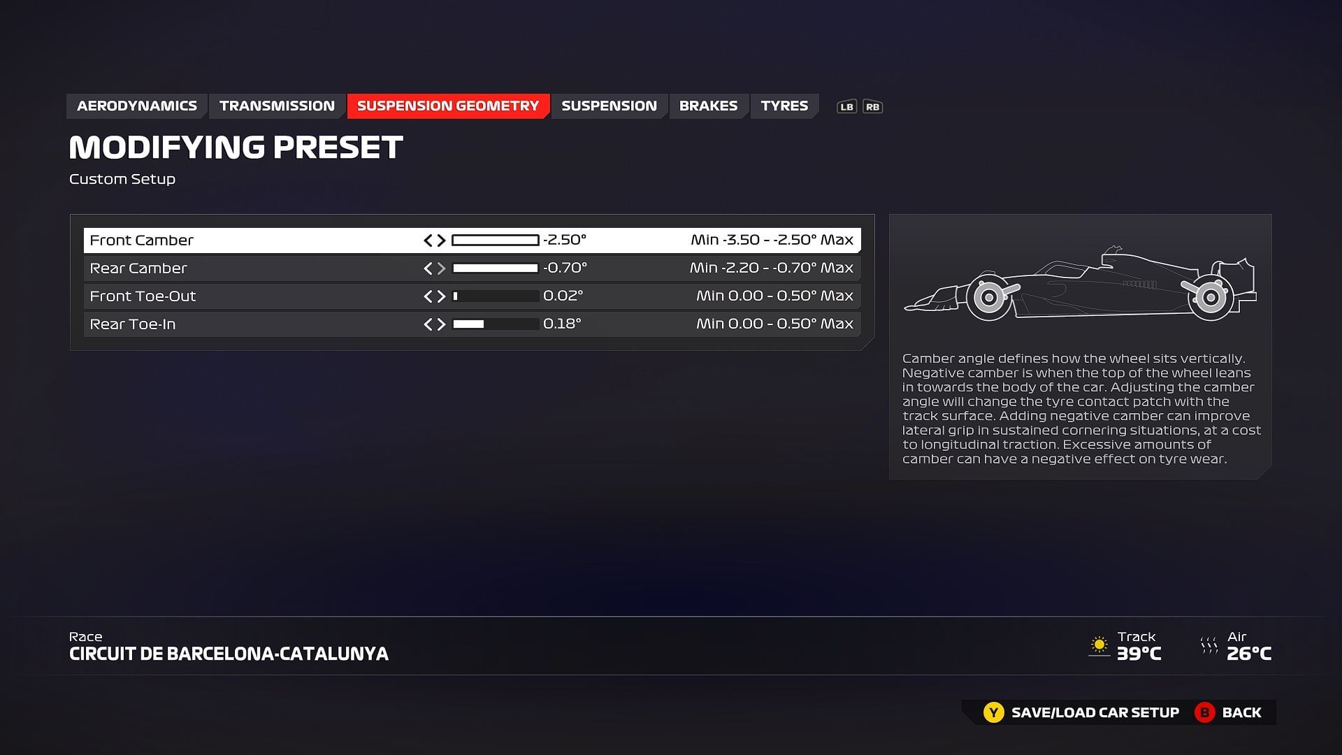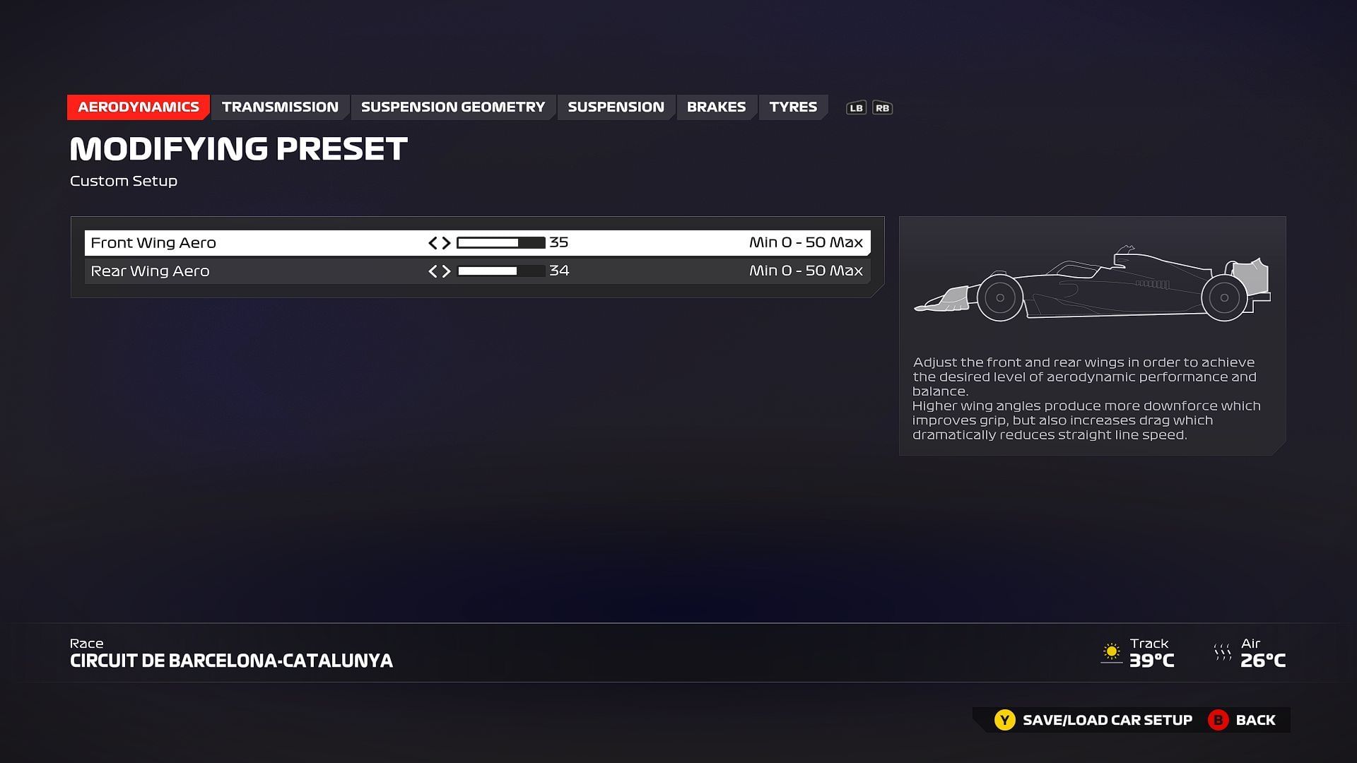 To excel at the Circuit de Barcelona-Catalunya, you need a setup that ensures good qualifying pace and a strategic advantage with tyre management. To help you achieve the best performance on this demanding circuit, the following setup is recommended.