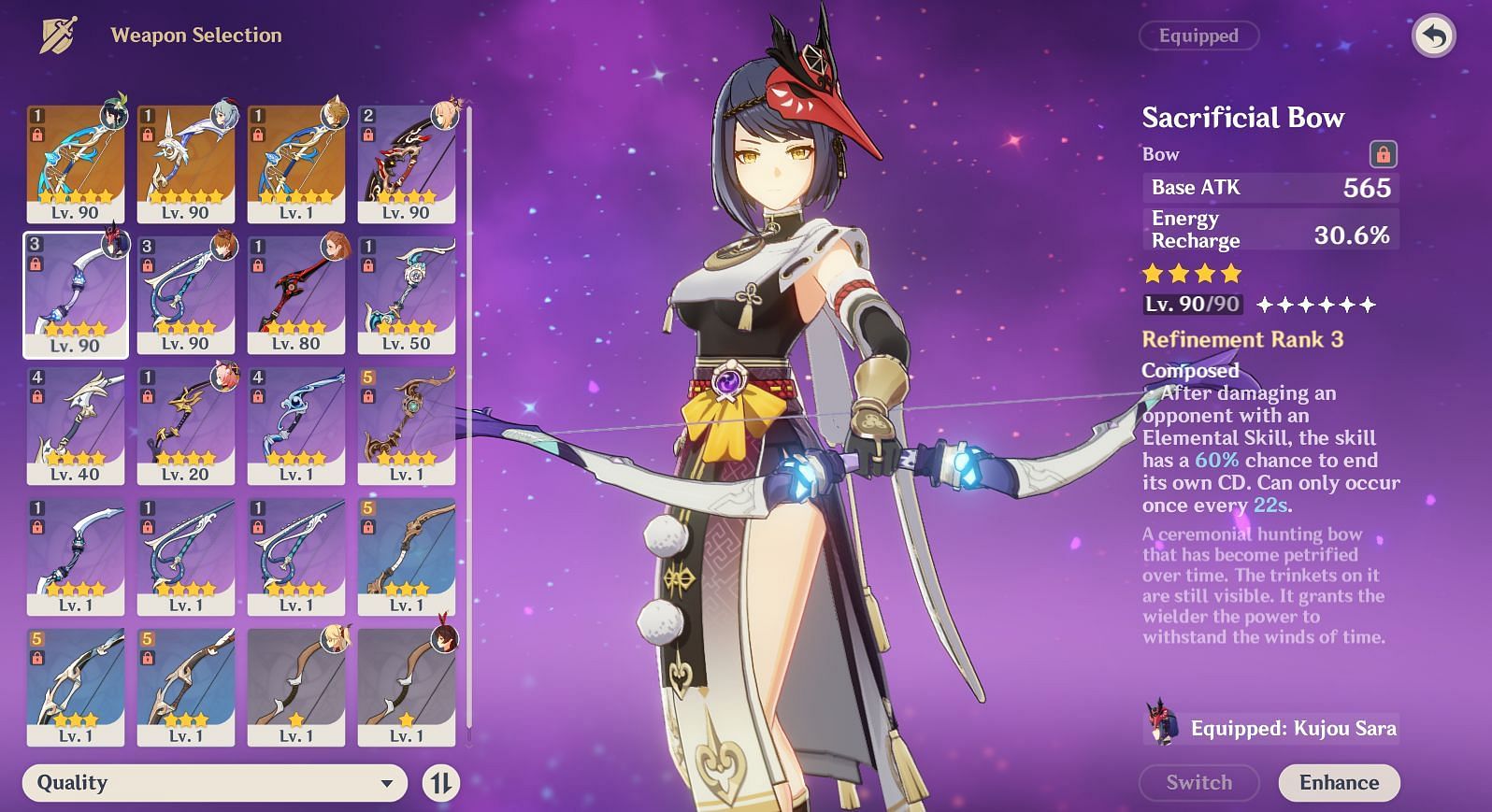 For 4-star bows, Sacrificial Bow is an excellent option because aside from the high base ATK, it also has the Energy Recharge sub-stat that allows her to refill her Elemental Burst faster. Stringless can be a 4-star replacement for Sacrificial Bow as its passive skill will increase her Elemental Skill and Burst damage.