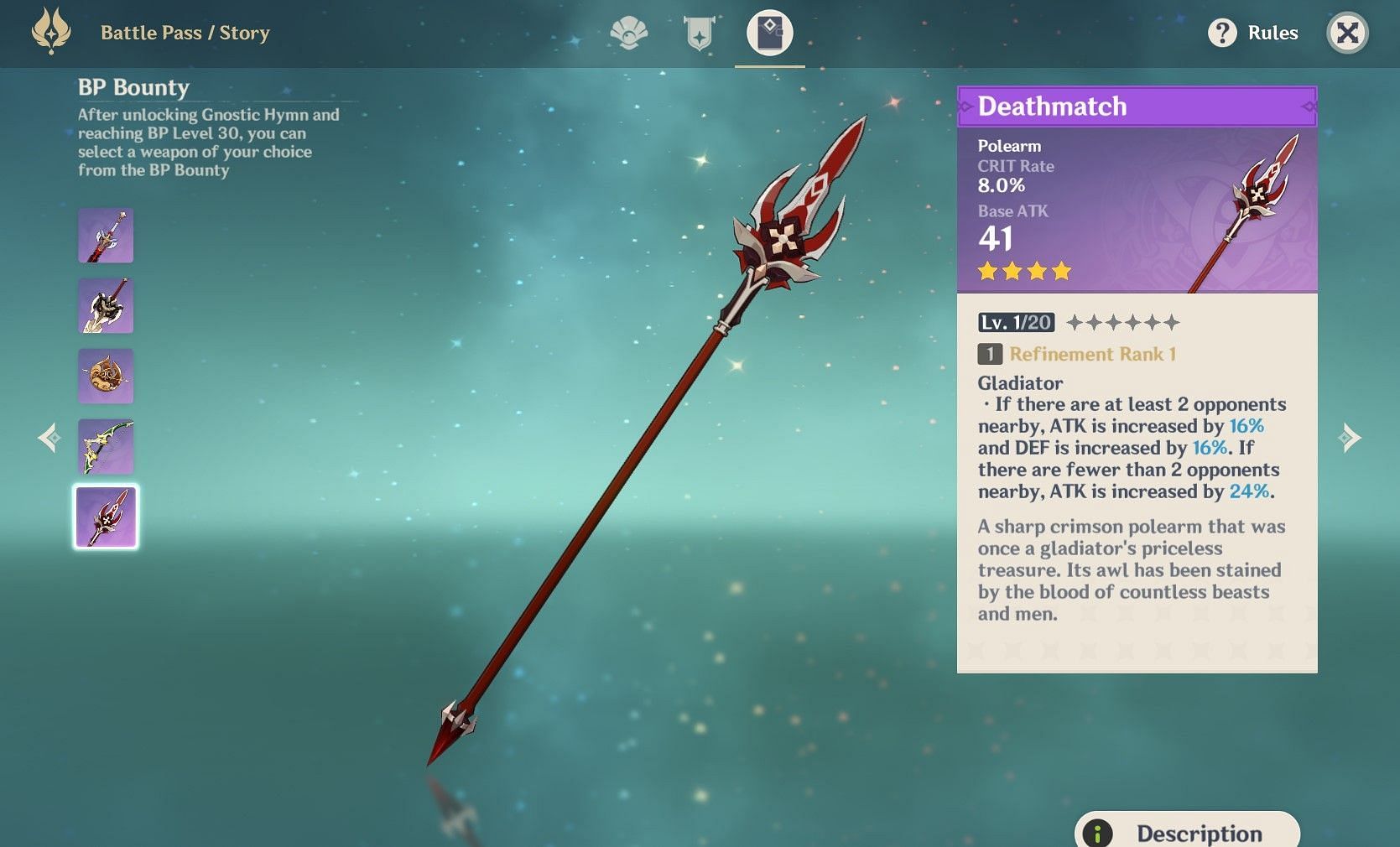 Deathmatch is a P2W weapon that players can only get by paying for the Gnostic Hymn and reaching BP Level 30. Still, it's an excellent 4-star polearm that boosts his CRIT Rate, and its effect is helpful throughout all of the Spiral Abyss.