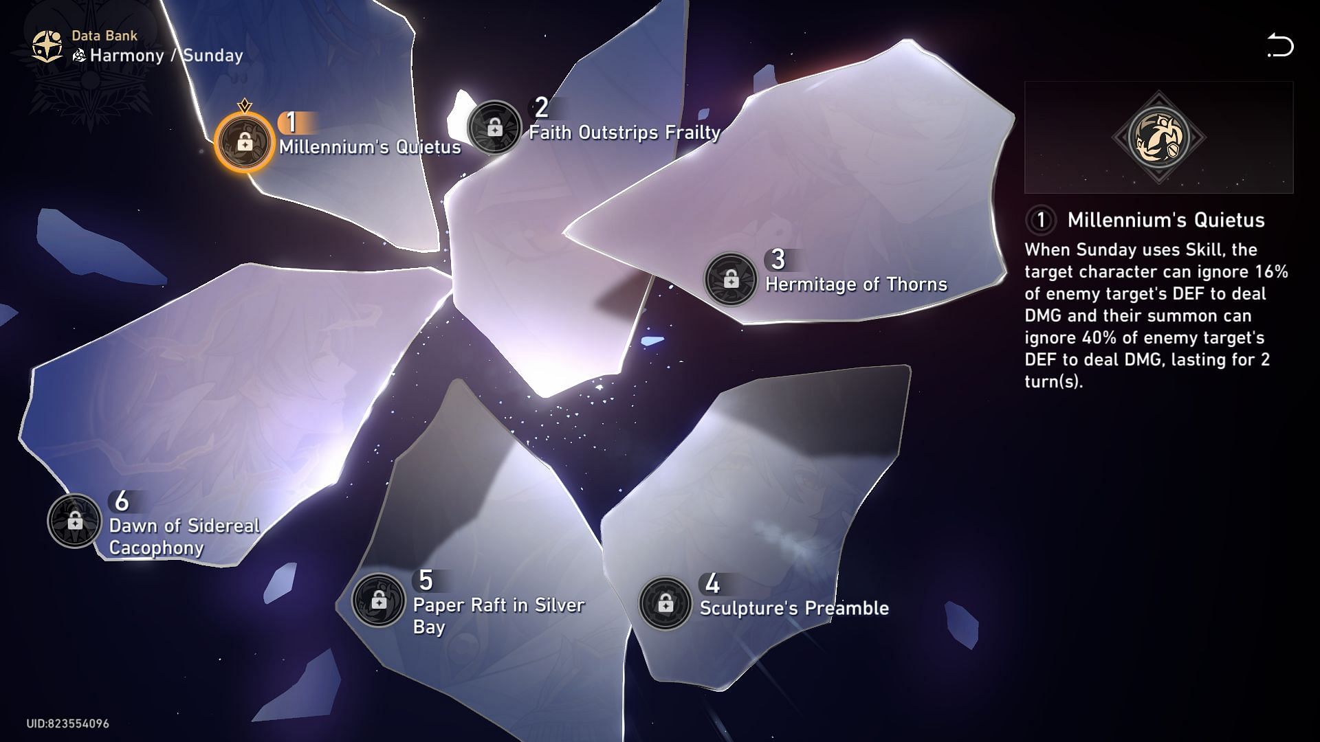 Since his damage-boosting buffs are CRIT-centric, Dawn of Sidereal Cacophony plays a major role in boosting their potency. It also indirectly grants an additional damage boost by converting the excess CRIT Rate into CRIT DMG. If you have the resources, this is a must-have Eidolon for Sunday in Honkai Star Rail.