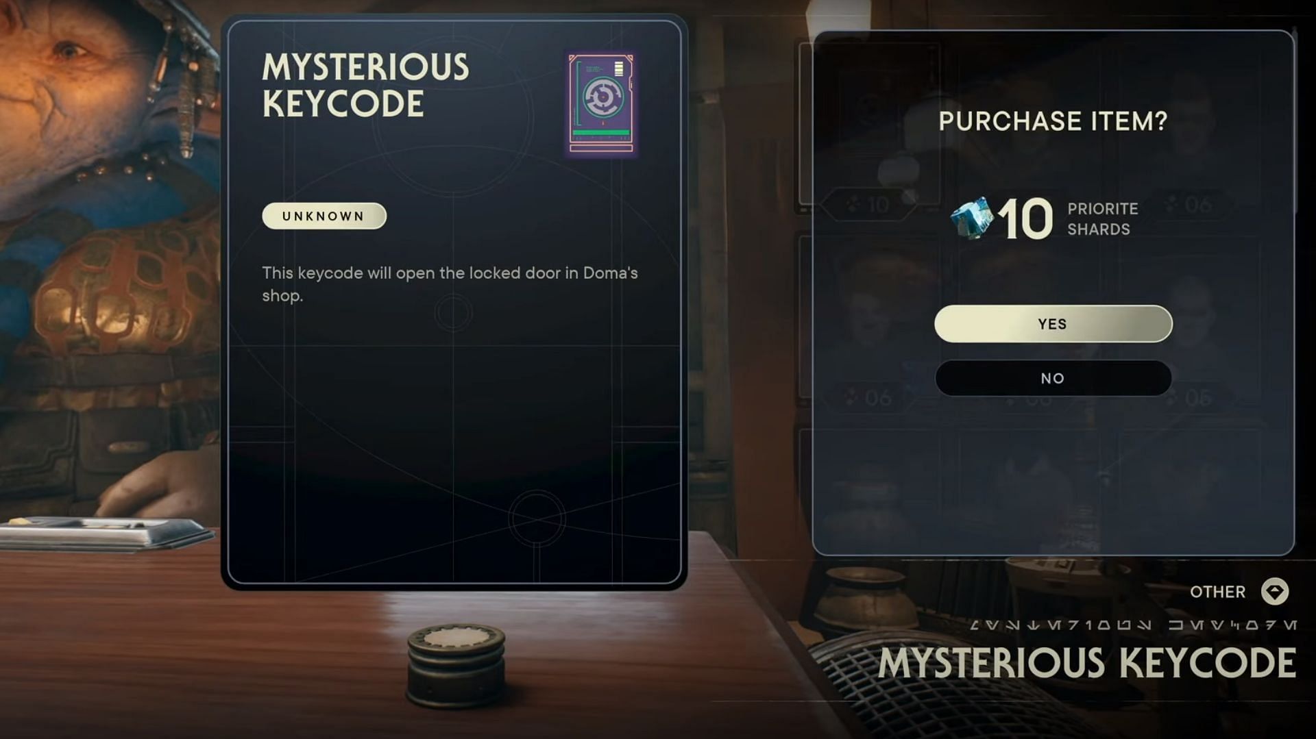 After unlocking it through the Rumor Quest "Visit Doma's Shop," you can access the Koboh-based store to unlock these items. Doma's shop uses a unique currency called Priorite Shards, which can be found scattered around the maps of Coruscant and Koboh.