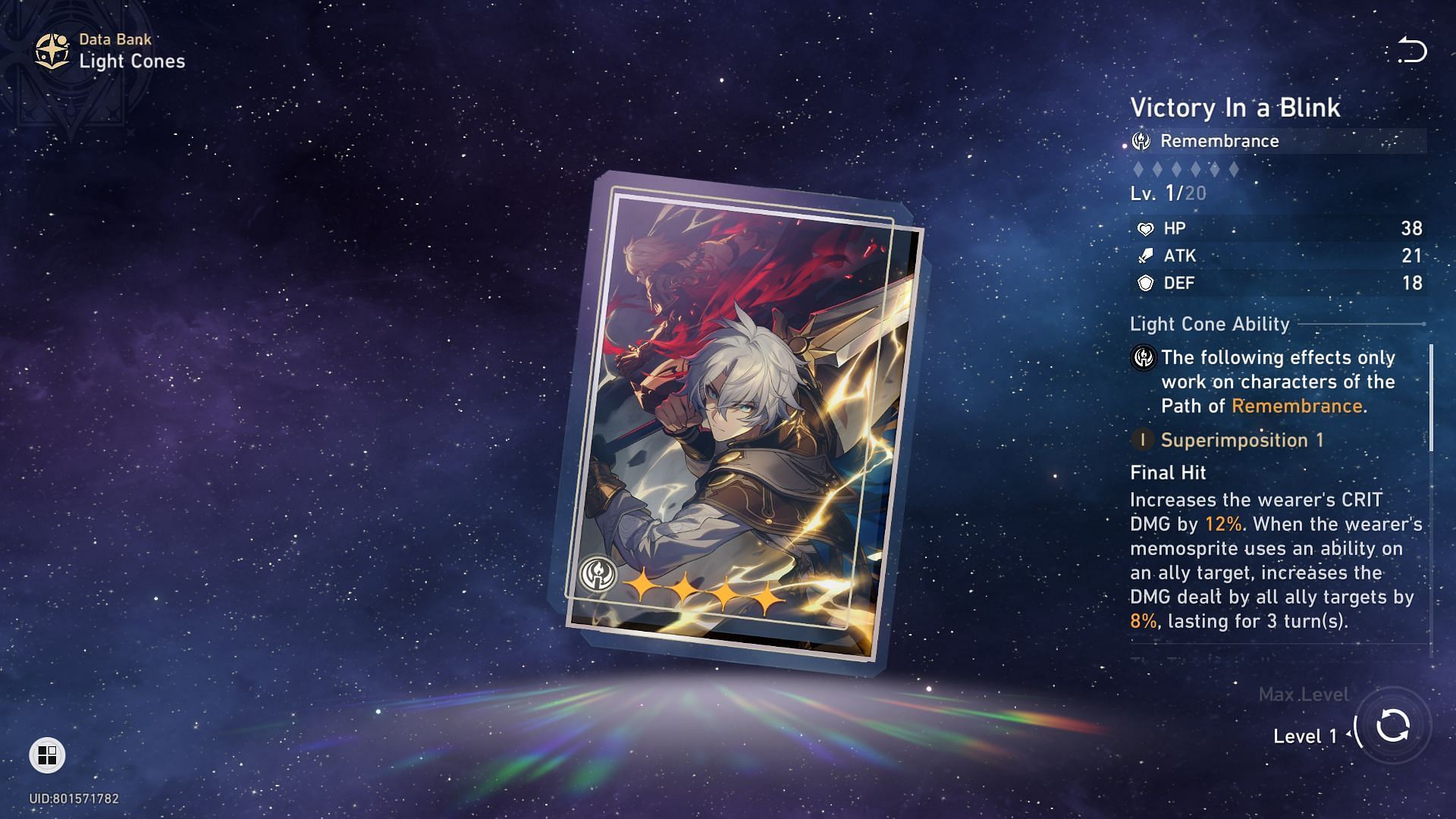 Victory In a Blink is an ideal Light Cone to build the Remembrance Trailblazer in Honkai Star Rail for a couple of reasons. For starters, the LC increases the wearer’s CRIT DMG by a whopping 12% at base level. Additionally, all ally’s DMG is increased by 8% when the equipping character’s memosprite uses an ability.’