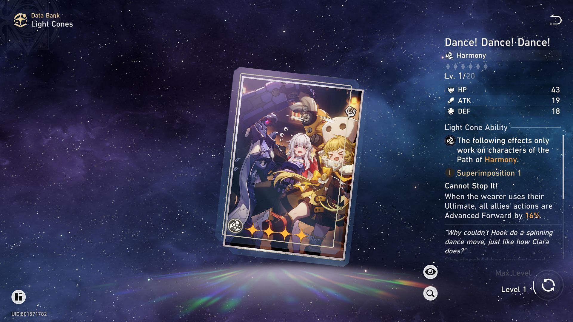 Tribbie can also use a couple of 4-star Light Cones in Honkai Star Rail. Among them, Dance! Dance! Dance! Serves as the best option since it is equipped with a neutral passive. The LC essentially advances the action of all allies by 16% after the wearer uses Ultimate.