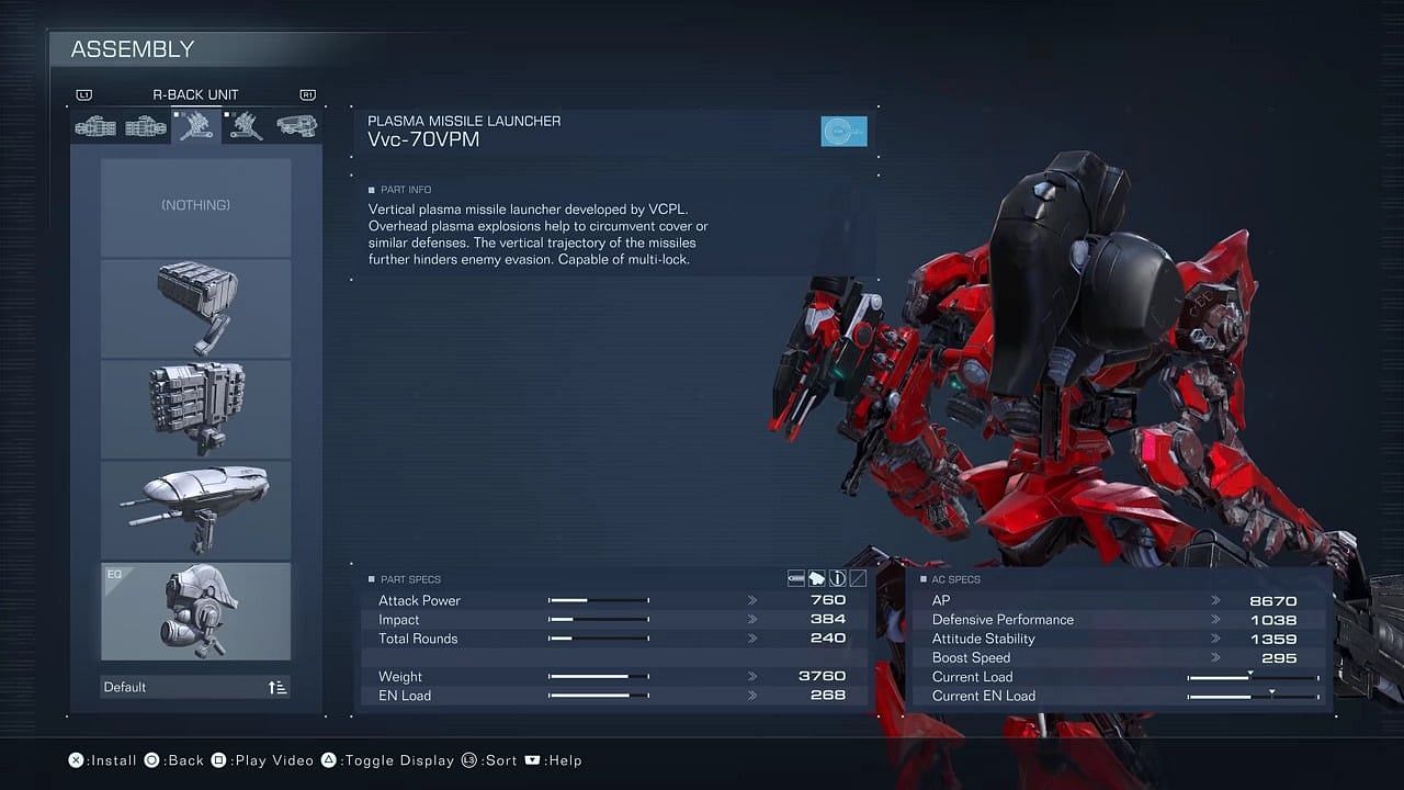 Finally, we come to the impressive Plasma Missile Launcher. This versatile back unit can be equipped in either of two unit placements, allowing for strategically customizing your loadout. Accessible at an affordable price of COAM 96,000 in the Parts Shop of the Garage, the Plasma Missile Launcher offers a compelling option that can significantly enhance your capabilities, even during the game's early stages.