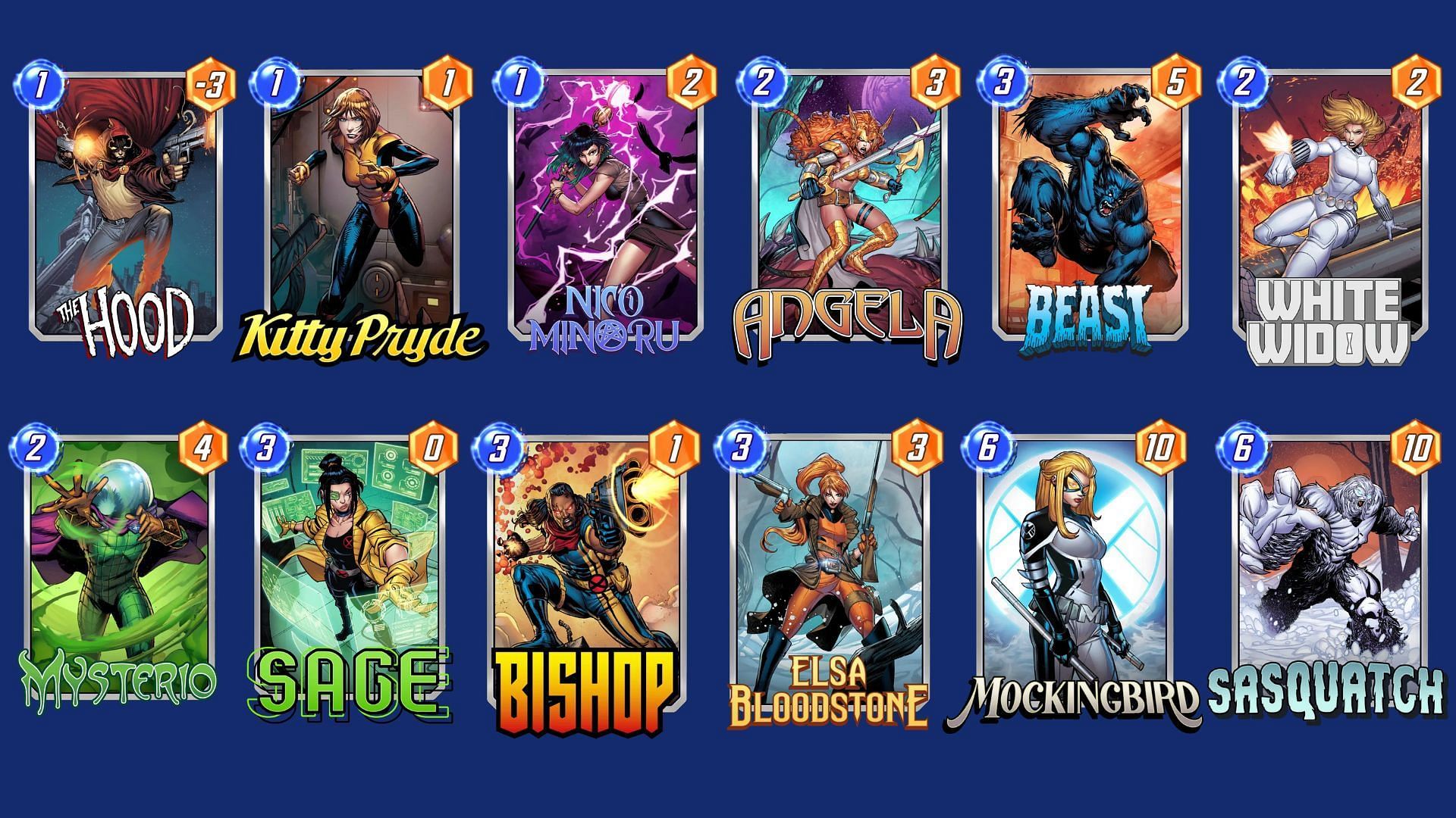 This deck combines mystical elements with playful mechanics. The focus is on utilizing Kitty Pryde and Mysterio to create a strong board presence while leveraging Sasquatch's ability for a significant power swing. Cards like Angela and Bishop benefit from playing multiple cards, enhancing overall power and maintaining board control simultaneously.