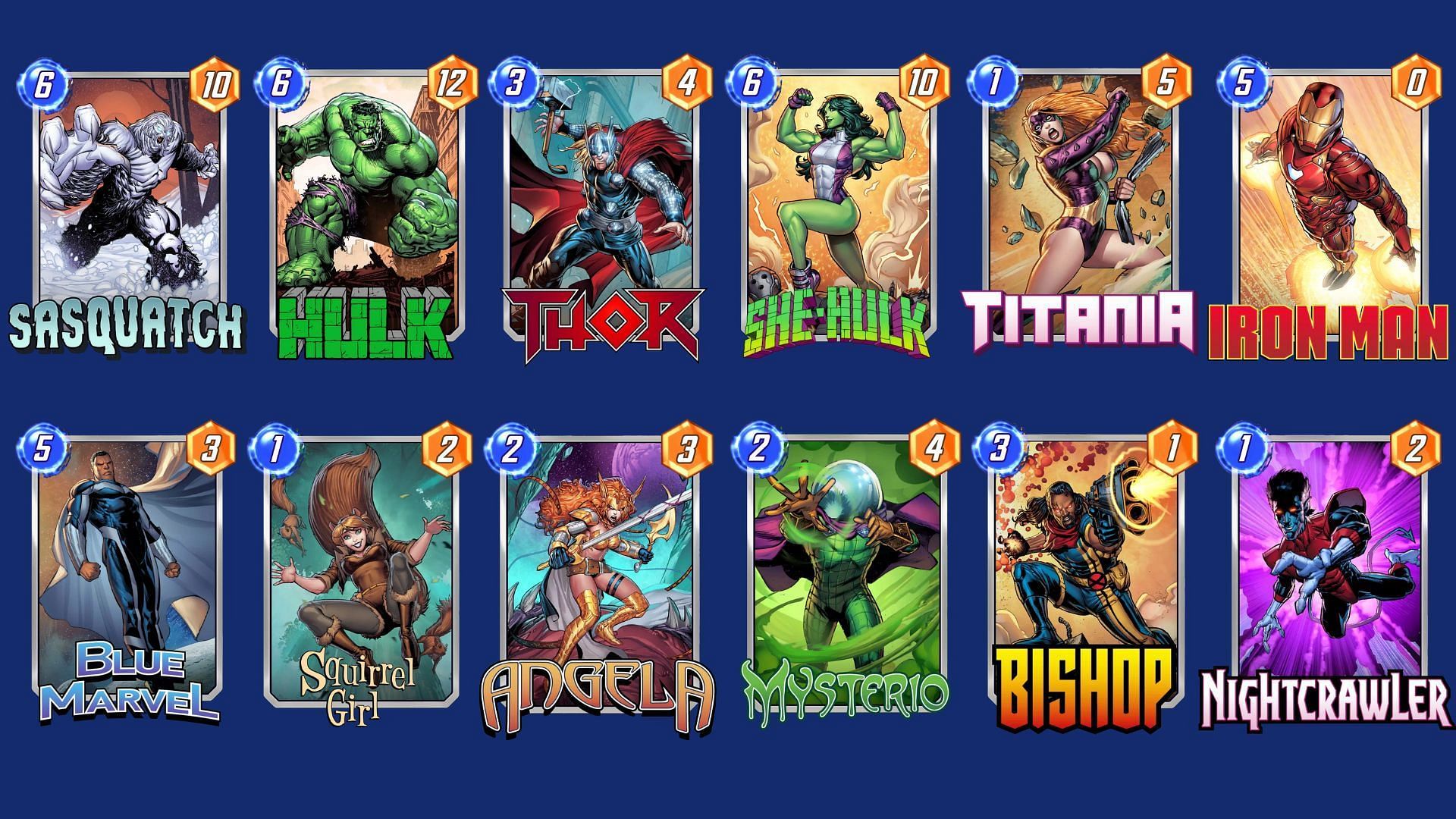 This deck emphasizes high-power plays, combining heavy hitters like Hulk and She-Hulk with supporting cards that enhance overall power levels, such as Iron Man and Blue Marvel. The strategy is to overwhelm opponents with sheer power while using cards like Squirrel Girl and Nightcrawler to maintain flexibility on the board.