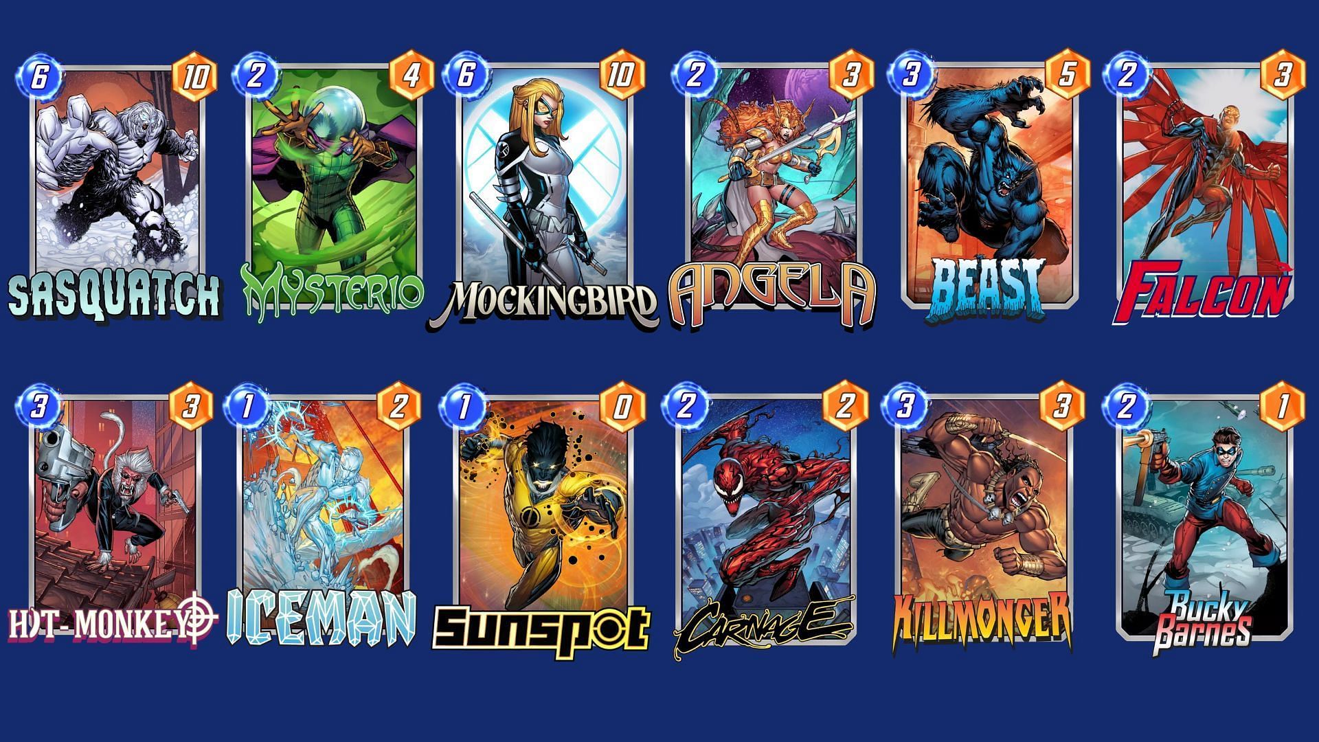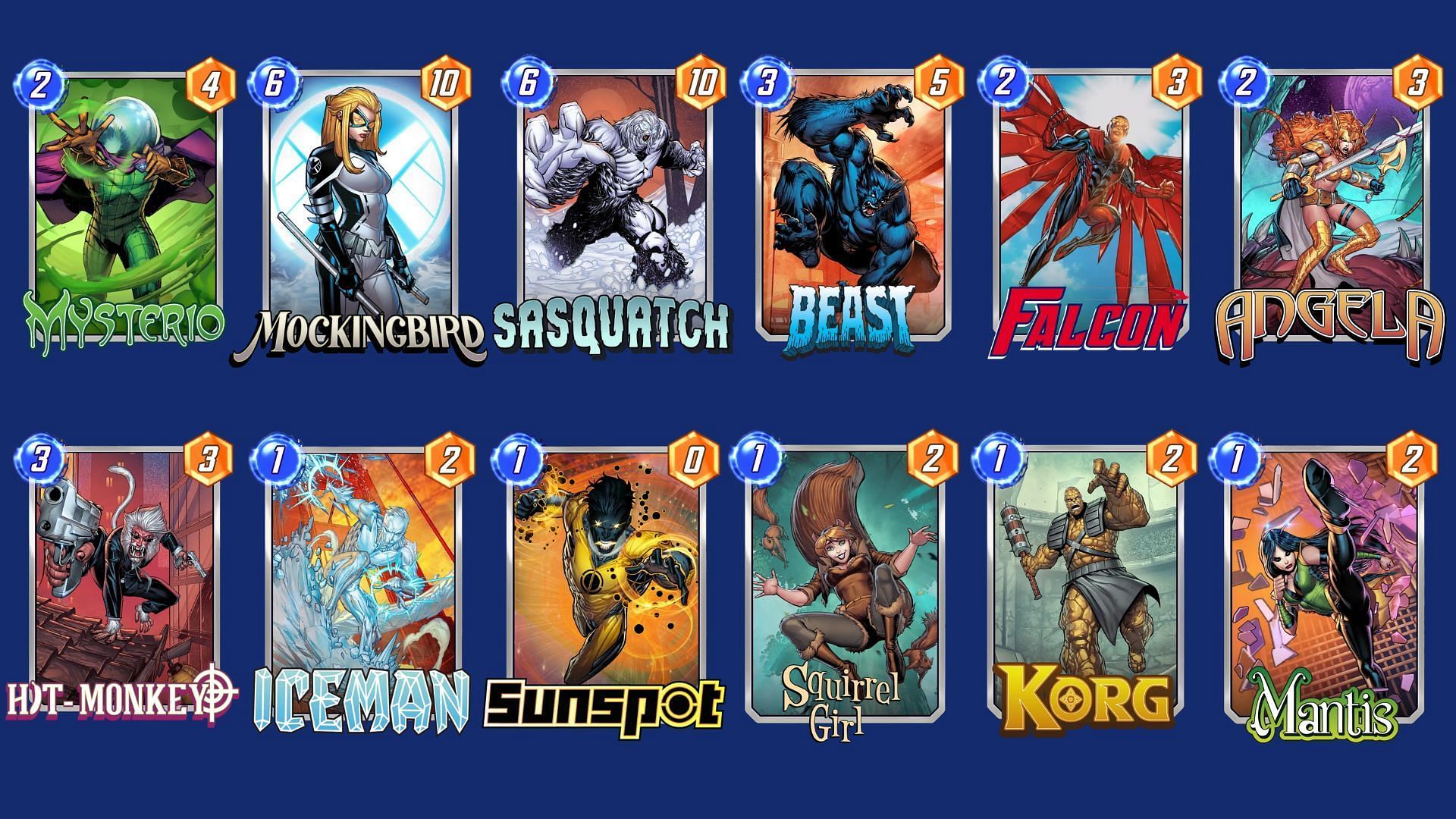 This deck aims to utilize the bounce mechanic to play multiple low-cost cards. Mysterio and Mockingbird help flood the board, allowing Sasquatch to be played at a reduced cost. Moreover, the synergy between cards like Beast and Falcon enables the recycling of cards, maintaining pressure while maximizing Sasquatch's power output.