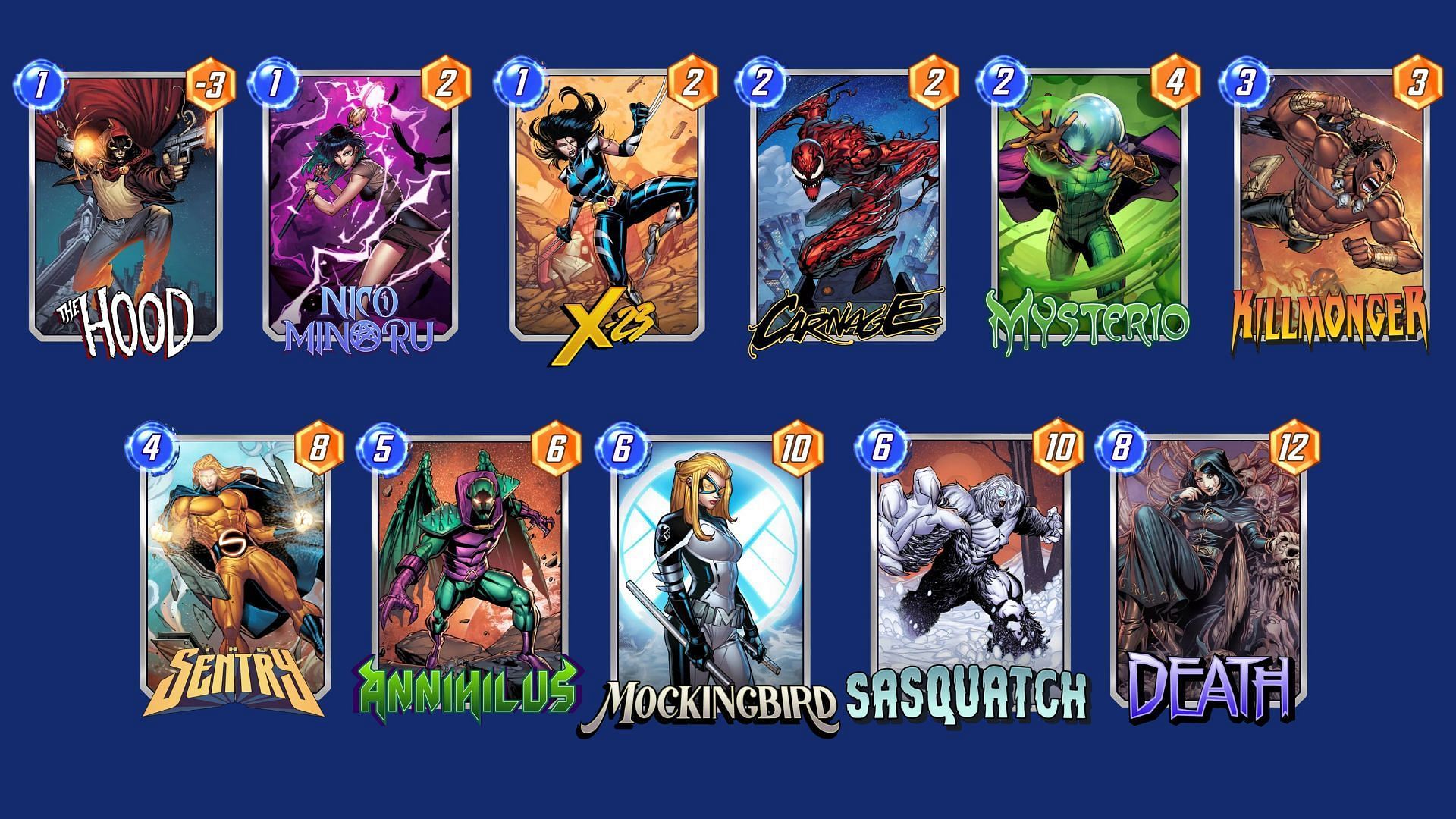 This deck revolves around destroying cards to reduce the cost of Death, allowing for powerful plays in the late game. Use The Hood and Carnage to generate destruction while building up power with other cards. The goal is to play Death for little to no cost alongside high-power cards like Annihilus or Sasquatch on the final turn.