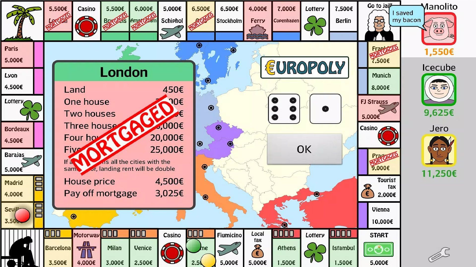 Europoly is slightly similar to Monopoly Go, featuring strategic gameplay mechanics and an aesthetically pleasing interface. Much like Monopoly, you must roll your dice and slowly make your way up the economic ladder. Consisting of four players, you can buy properties, build houses, and even drain your opponents of their wealth during the game.