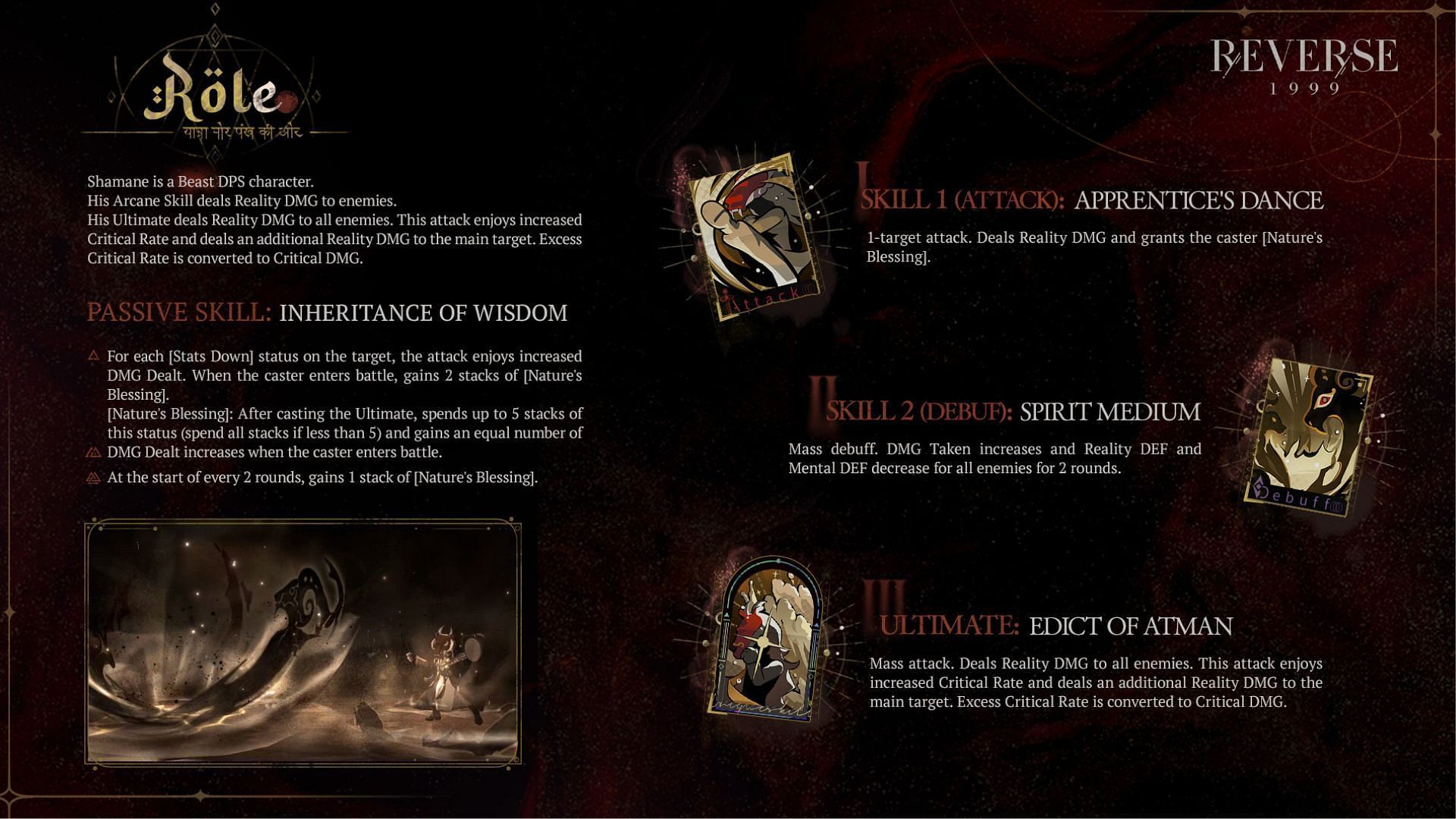 Shamane’s Beast Afflatus makes him weak to Mineral-type and strong against Plant-type enemies. His kit deals reality damage to enemies and can also apply debuffs. The Ultimate skill, Edict of Atman, enjoys an increased Critical Rate, allowing him to deal additional damage. Here is Shamane’s complete skills breakdown in Reverse 1999: