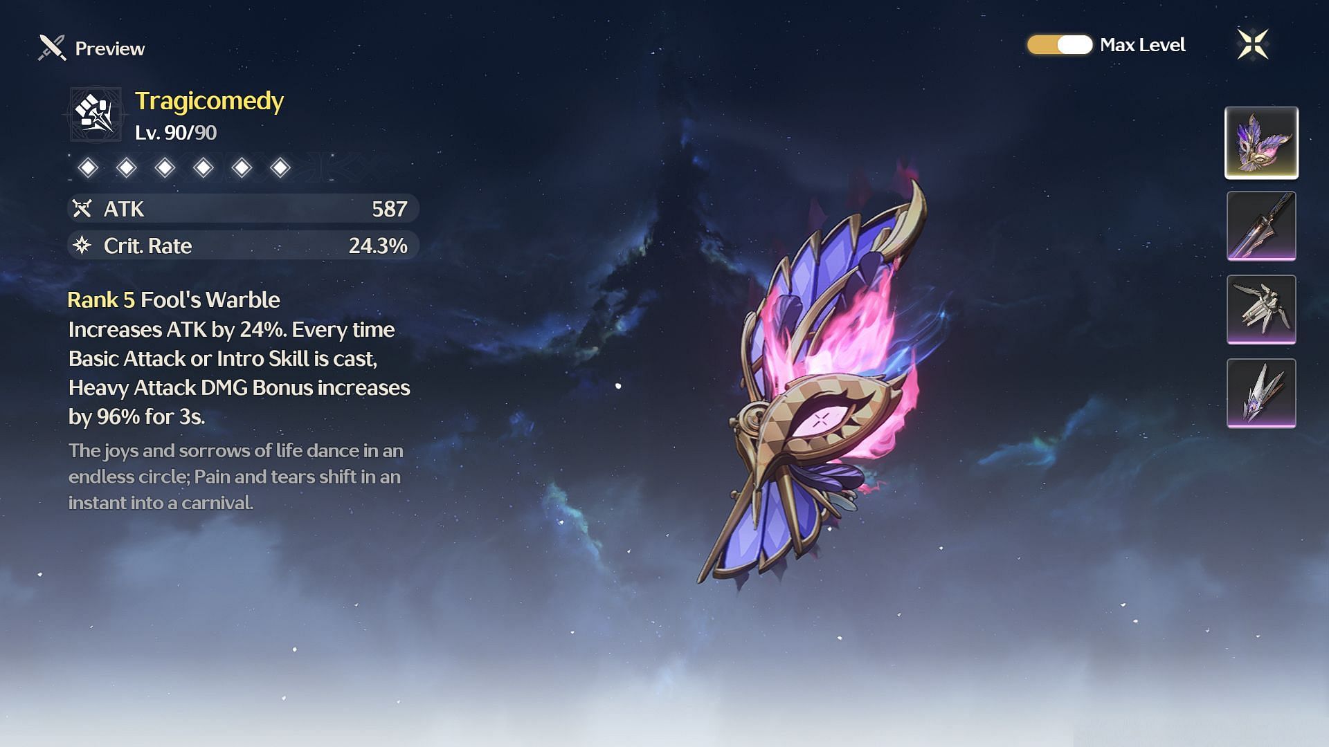 Tragicomedy is Roccia's signature weapon and the best weapon for her. It has a good Base ATK and gives a Crit. Rate bonus from its second stat. Furthermore, Tragicomedy's passive provides ATK% and Heavy Attack DMG bonuses.