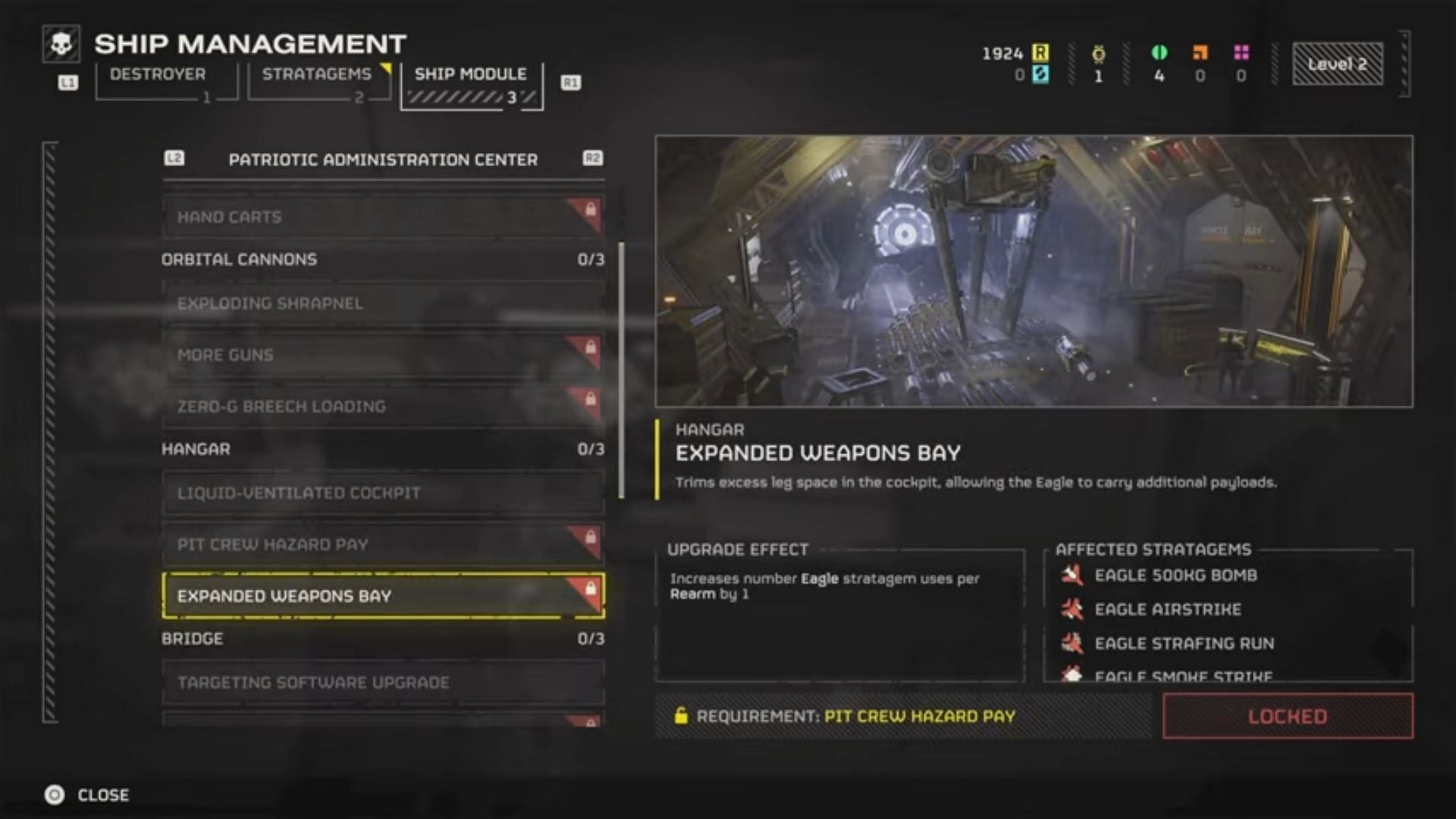 The Expanded Weapons Bay upgrade allows you to be more offensive on the battlefield. The Eagle Stratagem in Helldivers 2 is already one of the best in the game, and this particular Ship Module takes things to the next level. You gain an extra charge every time you use the Eagle Rearm ability, allowing you to mow down bosses and mobs easily.