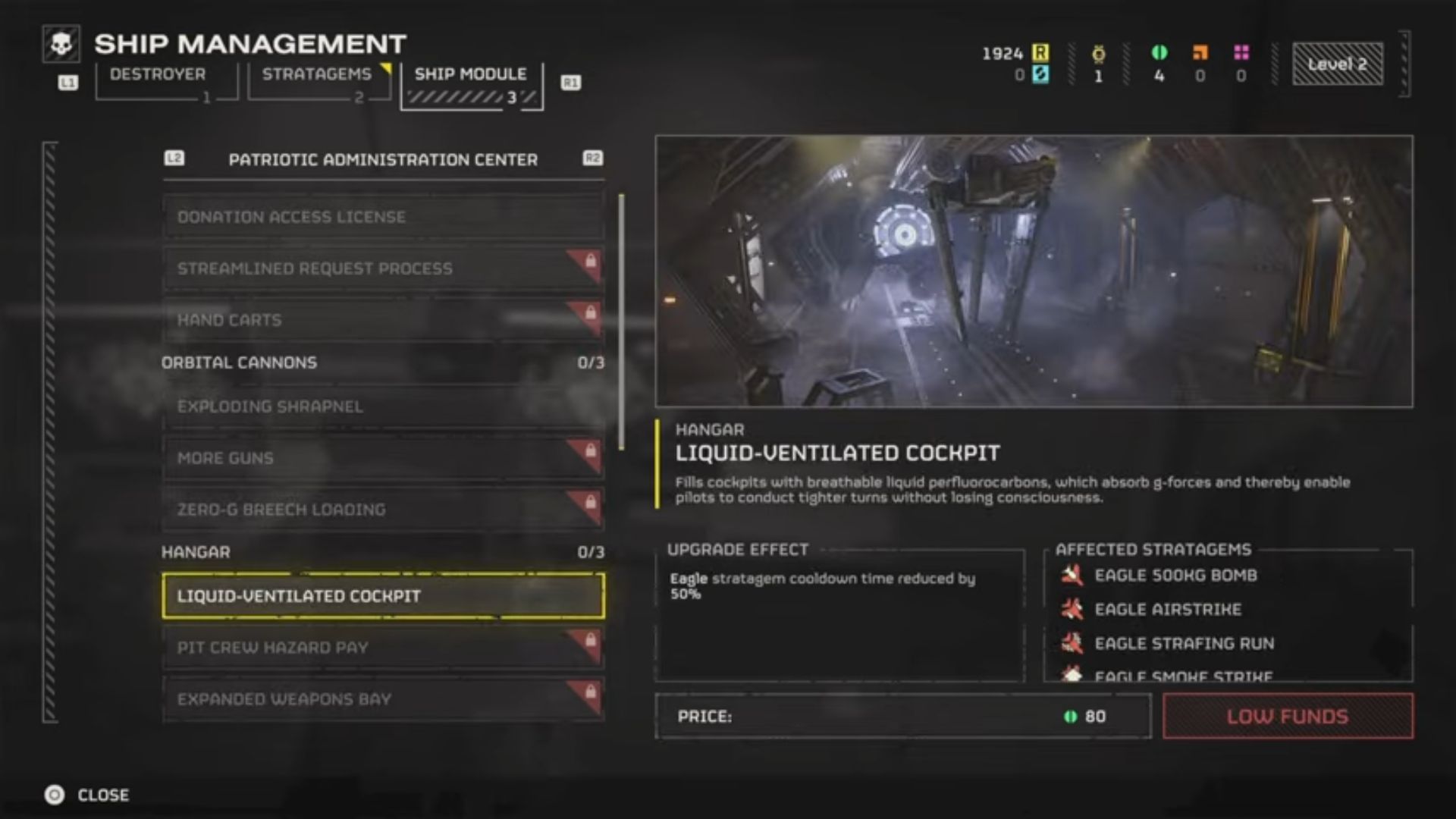 The Liquid-Ventilated Cockpit works similarly to Pit Crew Hazard Pay. The Eagle Stratagems are among the best because of their low cooldown. Furthermore, this module gives it a 50% reduction.