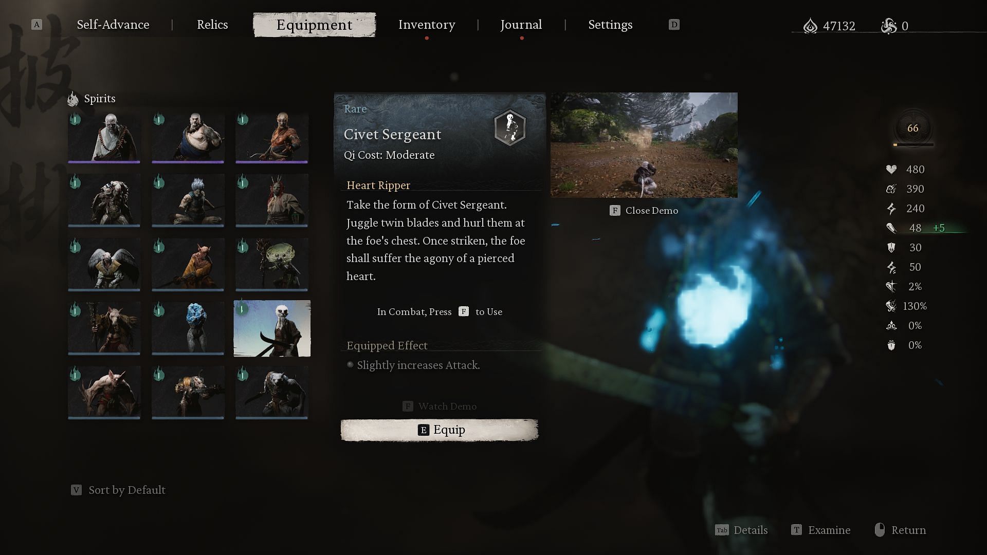 The Civet Sergeant can juggle twin blades and hurl them at the foe’s chest. Once you take the form of this Spirit, it will skip to the side and throw its blades at the enemy, dealing a decent amount of damage. If the blades connect with your target, they can also stagger them.