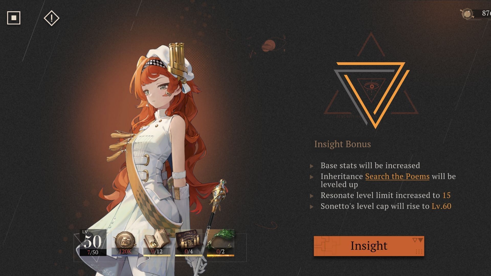 At Insight I, if she is in the Stats Up or Pos Status effect, Sonetto buffs herself by boosting her 15% damage-dealing ability. At Insight II, her Reality and Mental defenses increase by 10%. At Insight III, she gains 15% Critical Resist and Critical Defense if she is in Stats Up or Pos Status effects.